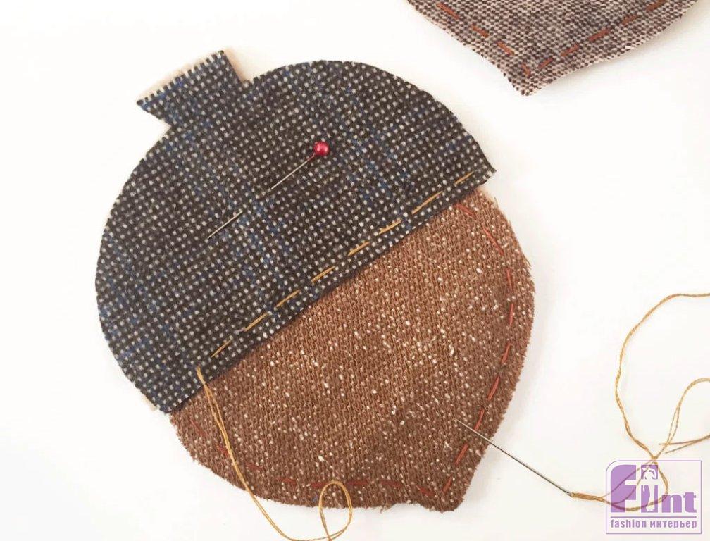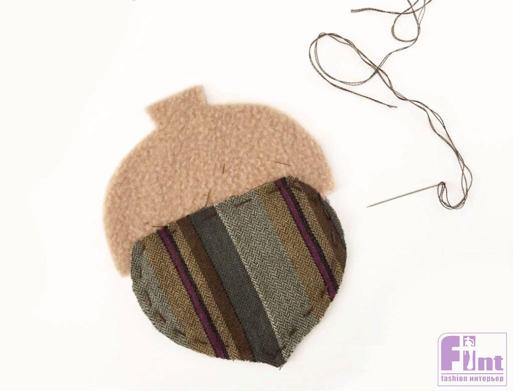 Сшейте вырезанные детали желудя вместе. Начните с размещения верхней и нижней частей желудя поверх каждой подложки из флиса или фетра. Вариантов сочетания ткани по оттенкам и узорам – множество! Это немного похоже на собирание мозаики. Как только вы определитесь с желудями, можно приступать к ручному шитью. Начните с нижней части желудя, используя мелкий проходной стежок. Для сшивания возьмите мулине контрастного к ткани цвета, чтобы стежки были хорошо видны. Прошейте верхнюю часть желудя таким же образом, используя мулине другого цвета.