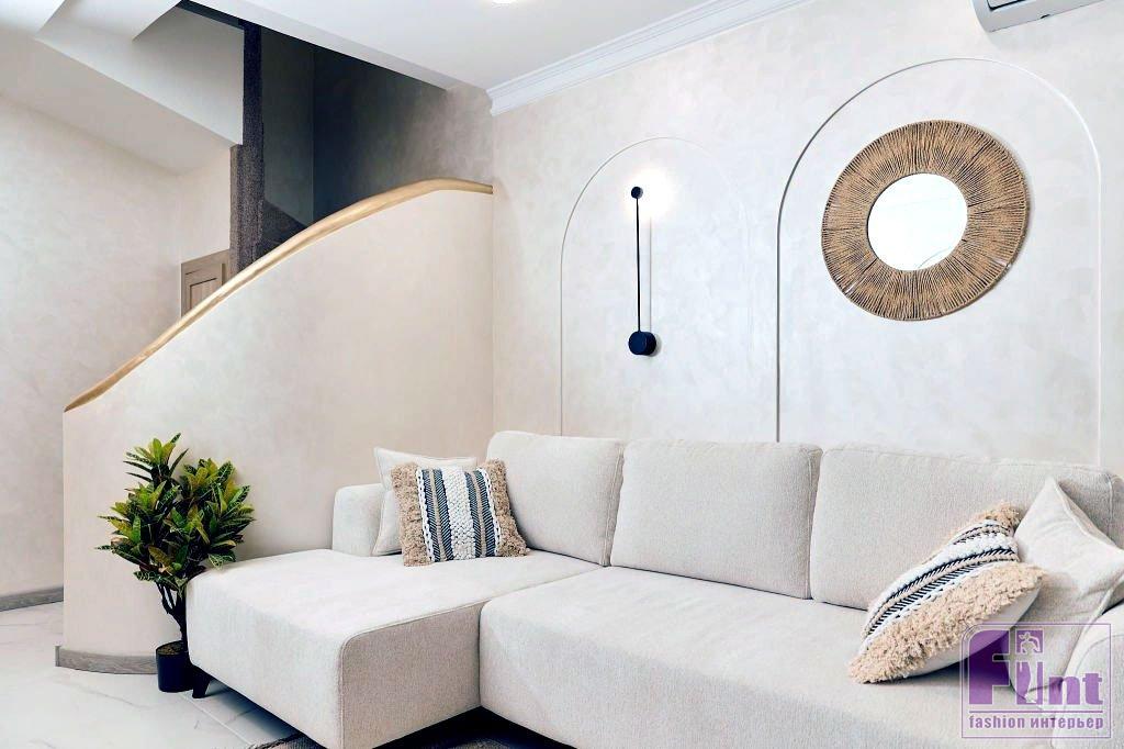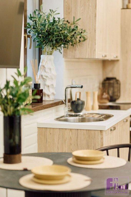 Дизайн кухни-гостиной вдохновлён островом Бали. В комнате использовали песочные оттенки — на стенах, в расцветке дивана и кухонного гарнитура. Основным элементом кухни-гостиной стал угловой диван Scott. Он раскладывается и служит дополнительным спальным местом в доме. Сглаженные мягкие углы дивана и высокие металлические опоры создают ощущение лёгкости и невесомости. Украшают диван декоративные подушки, которые перекликаются с зеркалом в ротанговой раме — эти декоративные элементы также служат напоминанием о Бали.