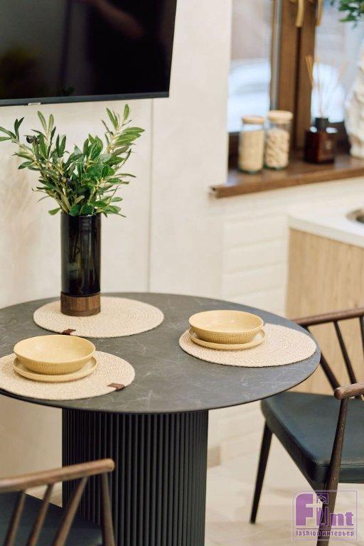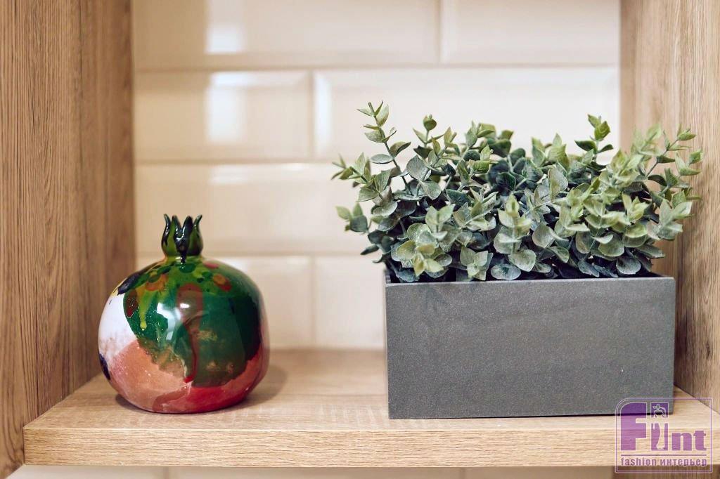 В каждой комнате есть декор, связанный с владельцем дома: часть Филипп купил сам в путешествиях, другие предметы ему подарили. В кухне-гостиной это расписная фигурка граната. Песочная кухня-гостиная украшена растениями — они напоминают о дикой природе острова Бали. Обеденная зона выполнена лаконично и дополнена дизайнерскими стульями с обивкой из натуральной кожи.