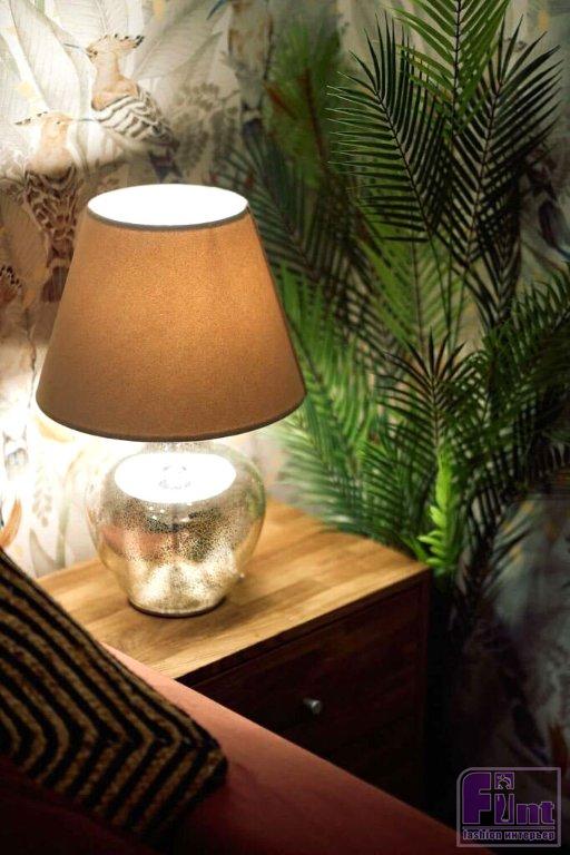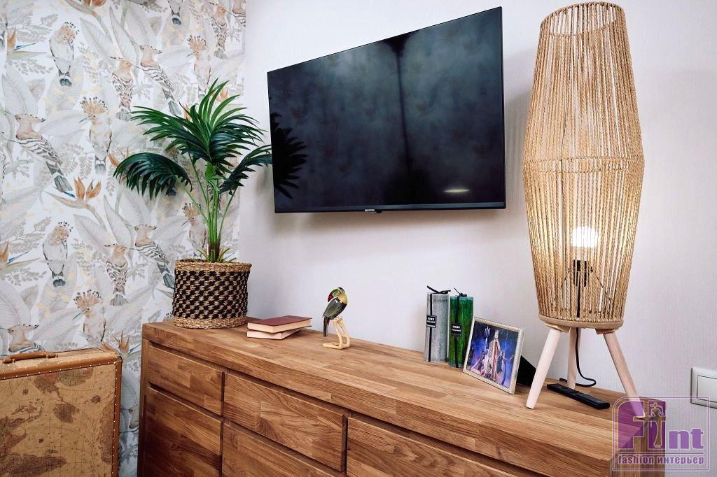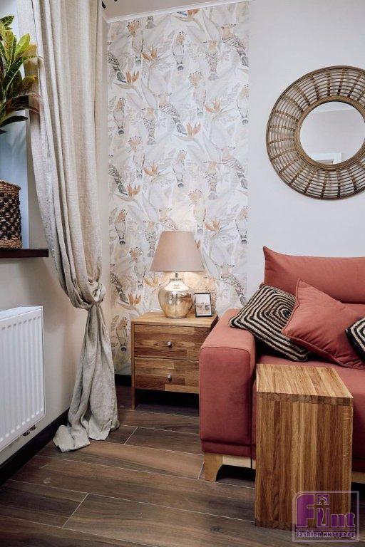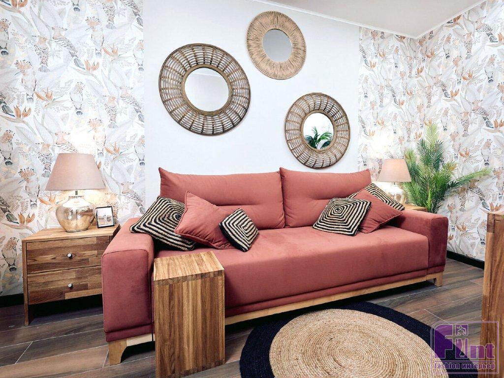 Интерьер кабинета отсылает к Африке. Например, на стенах использовали обои с тропическим рисунком и яркими птицами. Акцентом в комнате стал терракотовый диван Frost new. Дополняет его мебель из дерева в натуральном оттенке — комод из массива дуба Utah и прикроватный столик Sono, на который удобно поставить ноутбук или кружку чая. В качестве декора используются элементы, близкие к естественной натуральной среде: плетёные корзины, кашпо для цветов и растения, которые также отсылают к дикой природе. Подушки с принтом в стиле бохо перекликаются с зеркалами в необычных объёмных рамах и плетёным ковром — всё это напоминает об африканских хижинах.