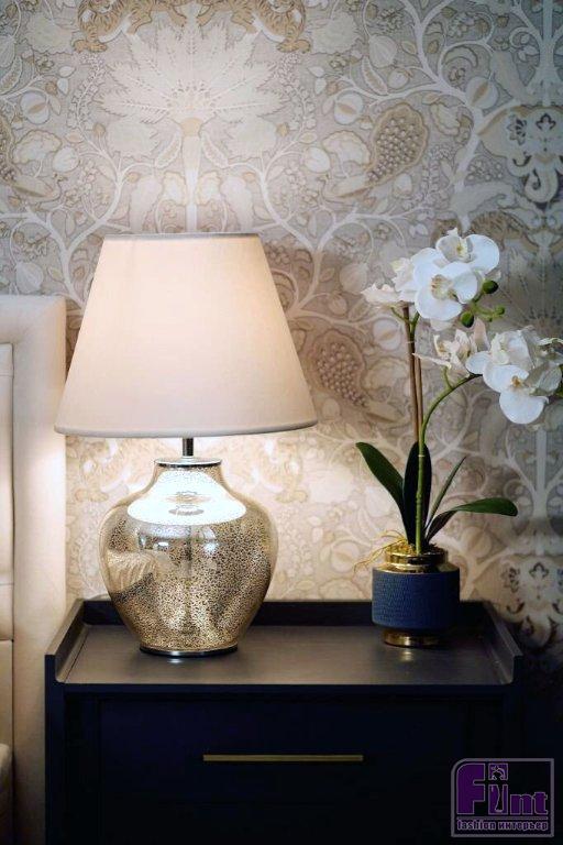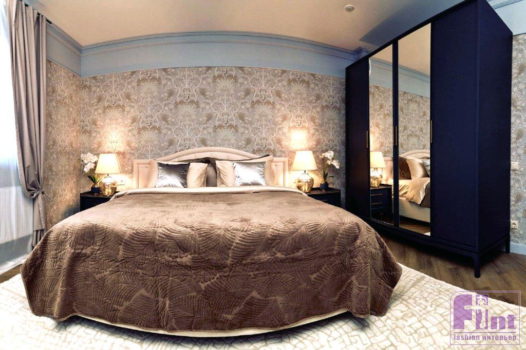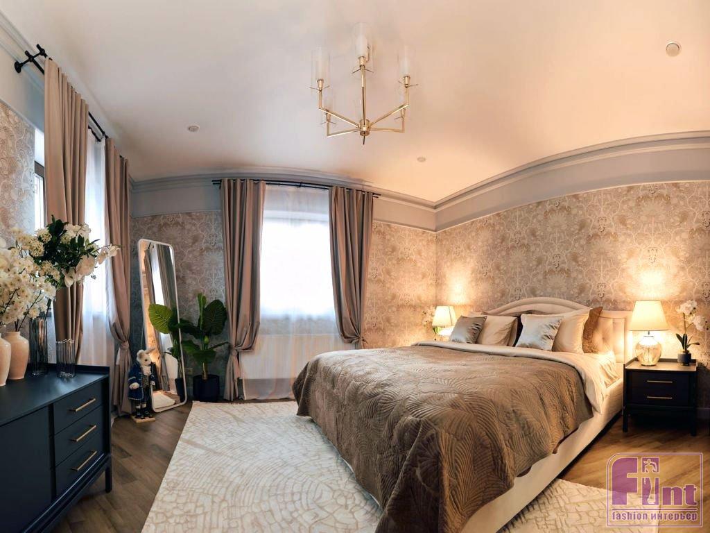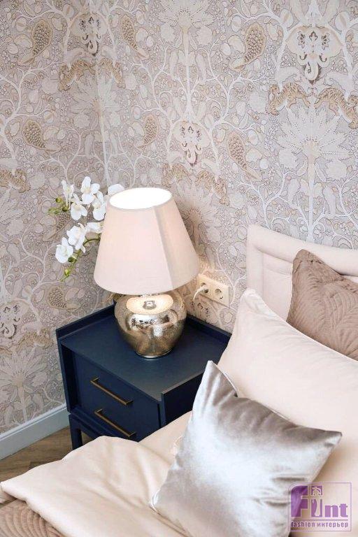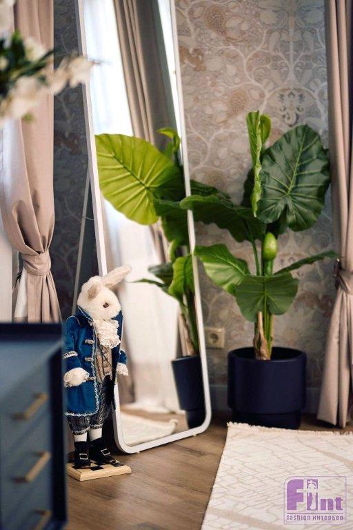 Первая спальня вдохновлена английским стилем. За основу дизайнеры взяли классические карнизы и обои с традиционным английским рисунком. Цветовая гамма комнаты получилась сдержанной и строгой, но в то же время уютной. Английская строгость передана и в мебели. Основным элементом спальни выступает кровать в классическом стиле — с изгибами на изголовье и с каретной стяжкой. Для хранения использовалась мебель из готового комплекта Una. Тёмный оттенок и золотые ручки мебели соответствуют сдержанному английскому стилю. В спальне снова можно встретить личные вещи хозяина. Здесь это статуэтка зайца: она отсылает к английской сказке «Алиса в стране чудес».