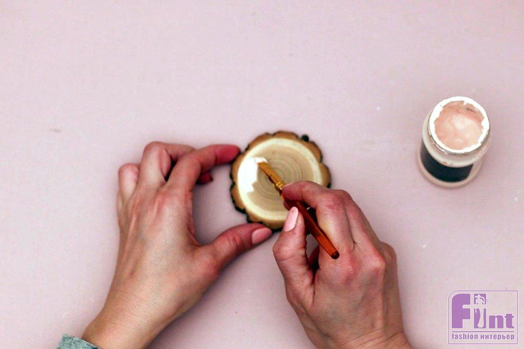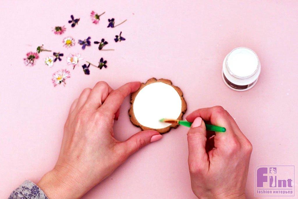 Покрасьте центр деревянного среза в выбранный вами цвет, используя акриловую краску. В данном случае мы выбрали светлый и нейтральный цвет, чтобы цветы выделялись на общем фоне. Нанесите краску кистью, оставляя край спила с корой нетронутым.