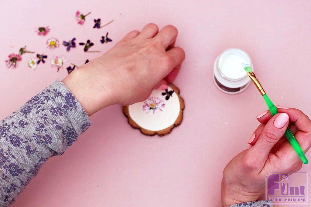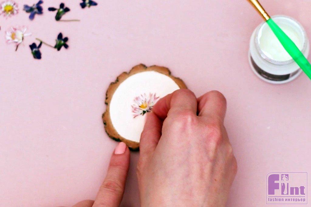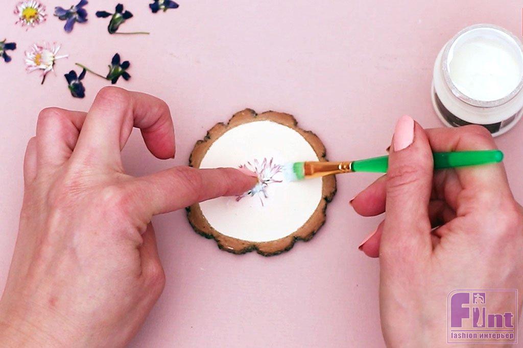 Выберите цветок для центра подставки и аккуратно закрепите его на месте, разгладив все его детали. Затем обмакните кисть в декупажный клей и покройте им цветок. Старайтесь действовать аккуратно, чтобы не сдвинуть и не повредить сухоцвет.