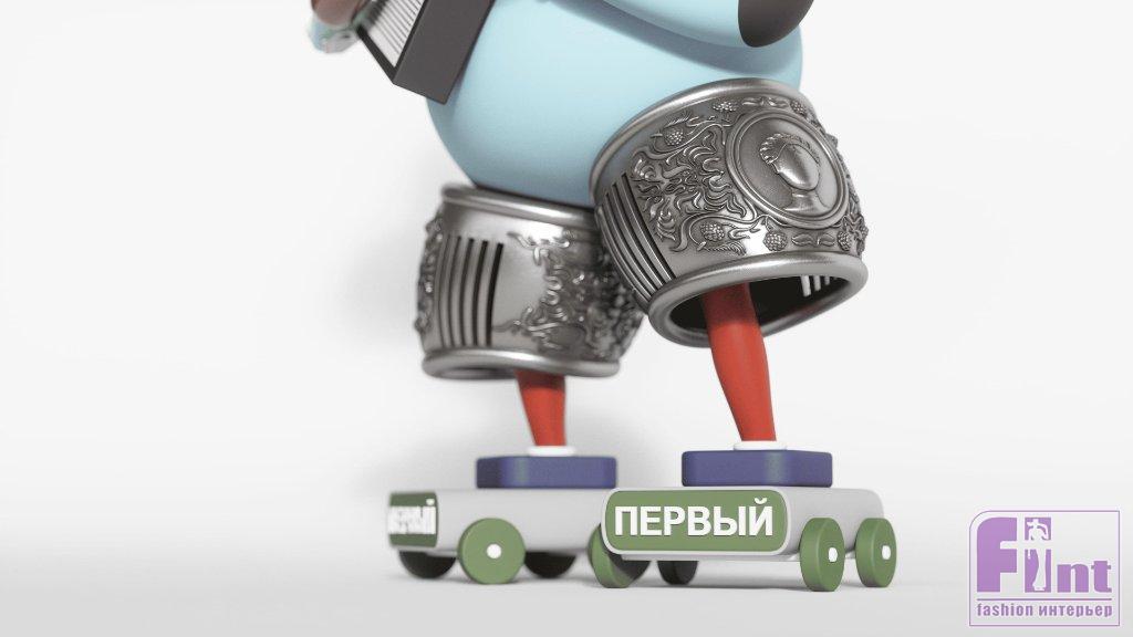 Так, например, надпись «Первый» на ботинках персонажа в форме автомобилей символизирует лидерство Советского Союза в области технологий и науки, а рука-рюмка — к известному советскому плакату «Нет!». Вторая рука сделана в виде деталей из знаменитого детского конструктора и заканчивается красной варежкой (сразу же вспоминается кукольный мультфильм «Варежка»), которая держит советский радиоприемник, неотъемлемый атрибут каждой квартиры и дачи во времена СССР.