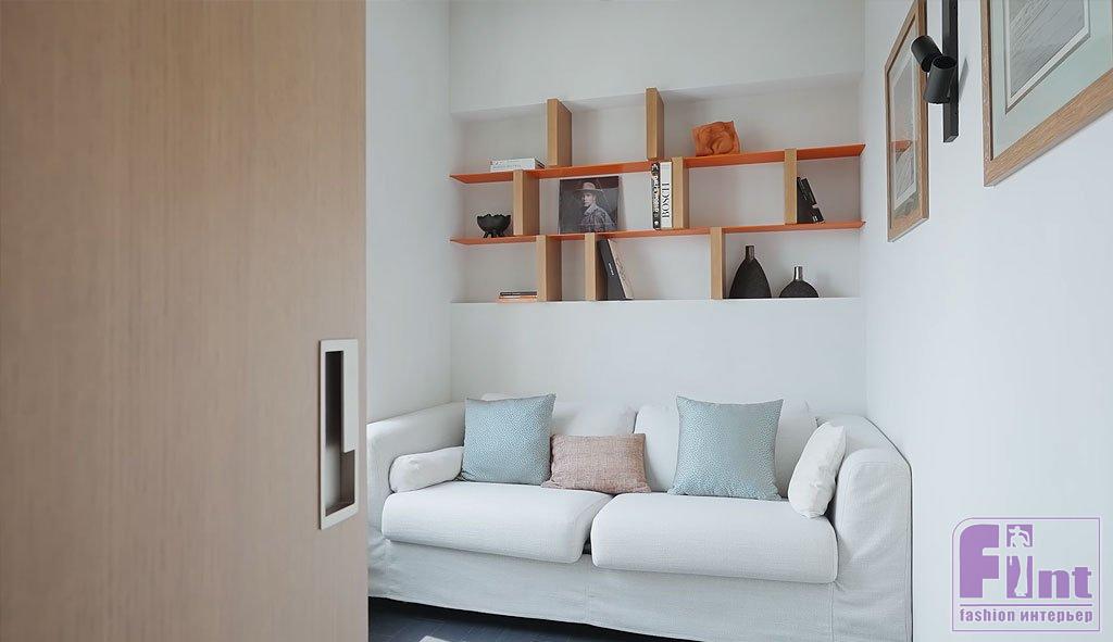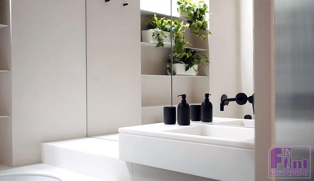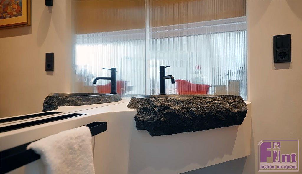 В квартире Фомина — два этажа, поэтому для удобства были сделаны и два санузла. Один из них, на первом этаже, примыкает прямо к стенке кухни, где находится фартук из ребристого матового стекла. В туалете это стекло служит в качестве дополнительного источника света. Небольшое пространство также визуально расширяется за счёт зеркала во всю стену. За чёрным санузлом установлен ярко-оранжевый шкаф для хранения вещей. В мини-санузле установлена раковина из натурального камня.
