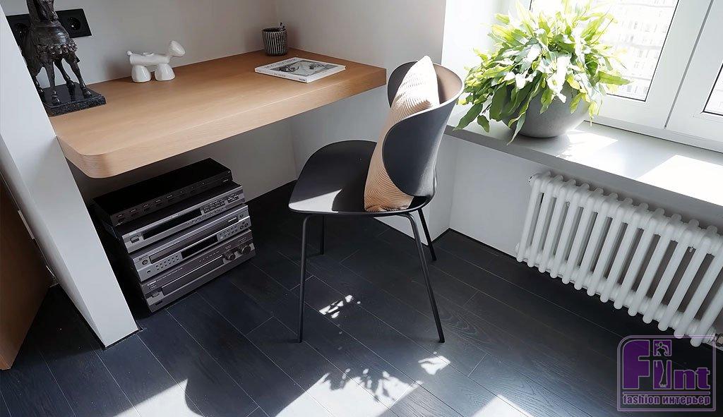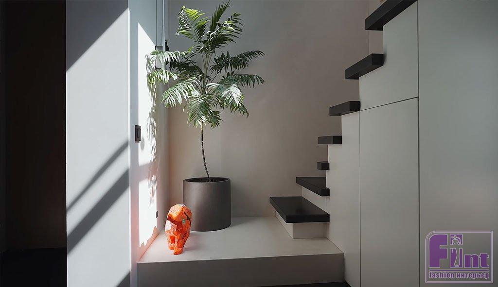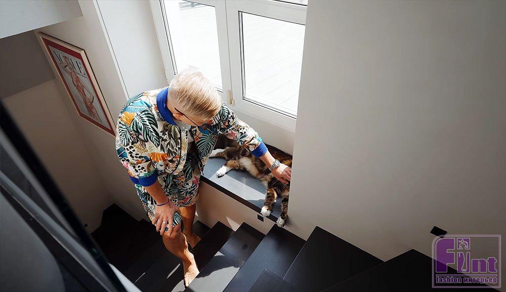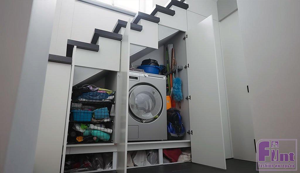 На второй этаж квартиры ведёт уникальная лестница со встроенными системами хранения — это самый дорогой предмет интерьера. Раньше она вела в другую сторону, поэтому её пришлось полностью переделывать заново. Однако это того стоило, так как под лестницей есть «начинка» — встроенные шкафы для хранения вещей. «Они выполнены совершенно филигранно, потому что мы сюда спрятали "печень" дома», — говорит хозяин квартиры, распахивая один из шкафов. В нём находится, вопреки всяческим ожиданиям, стиральная машинка, а в отделении рядом — сушилка.