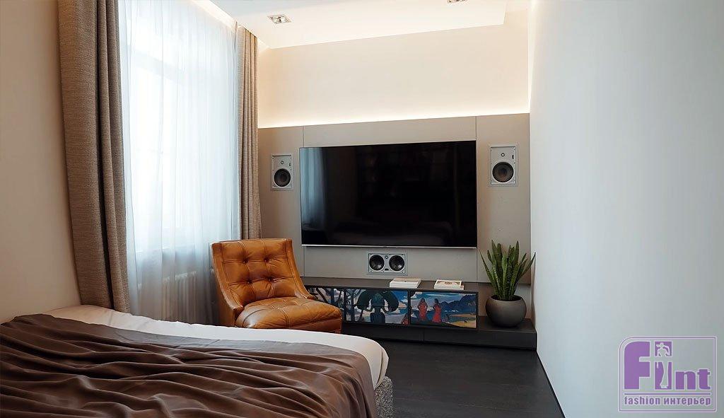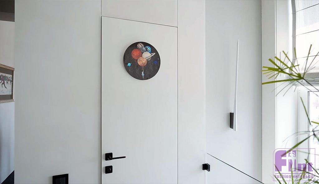 Перпендикулярно встроенным шкафам установлены зеркальные двери, ведущие в гардероб. «Туда я вас не пущу, потому что имею права на какие-то секреты, какие-то тайны. Но могу сказать, что он не очень большой. Его никто никогда не видел — пусть это будет мой скелет в шкафу», — объяснил свое желание не показывать «святая святых» Фомин.