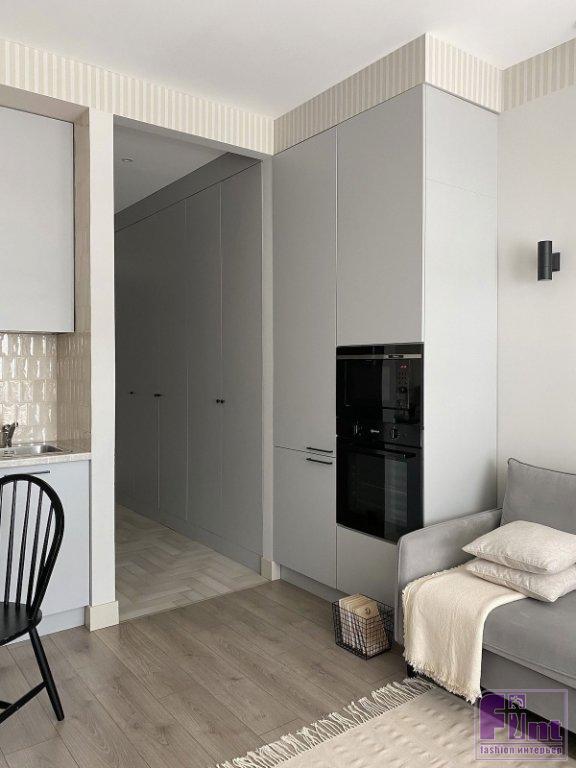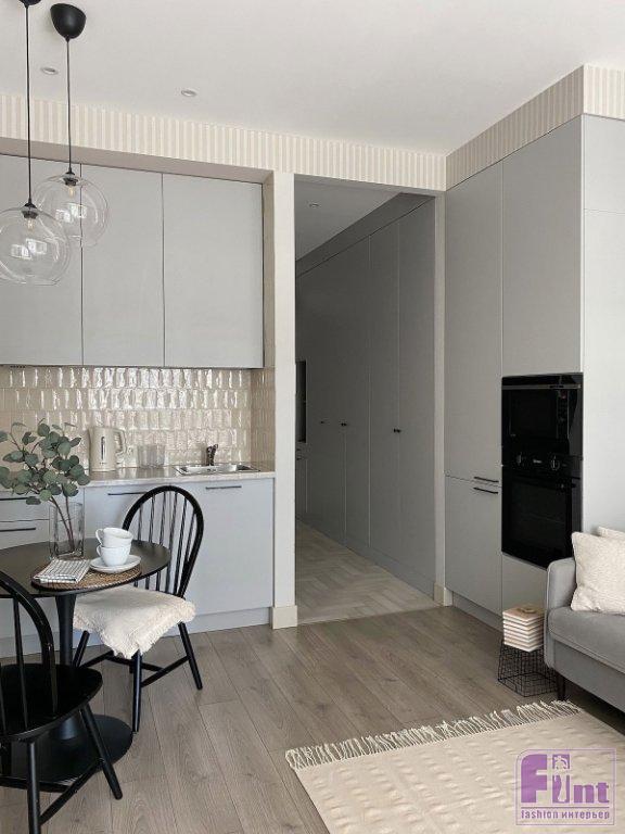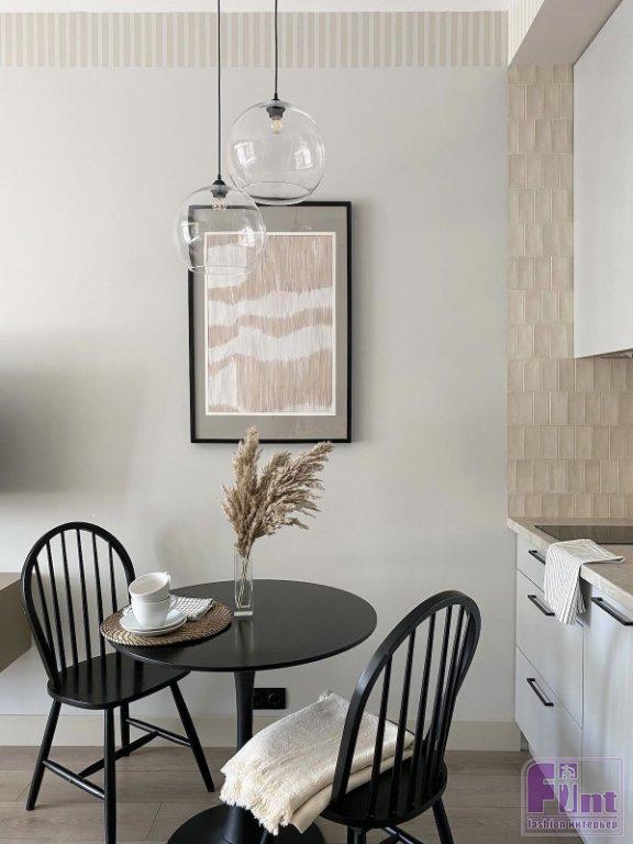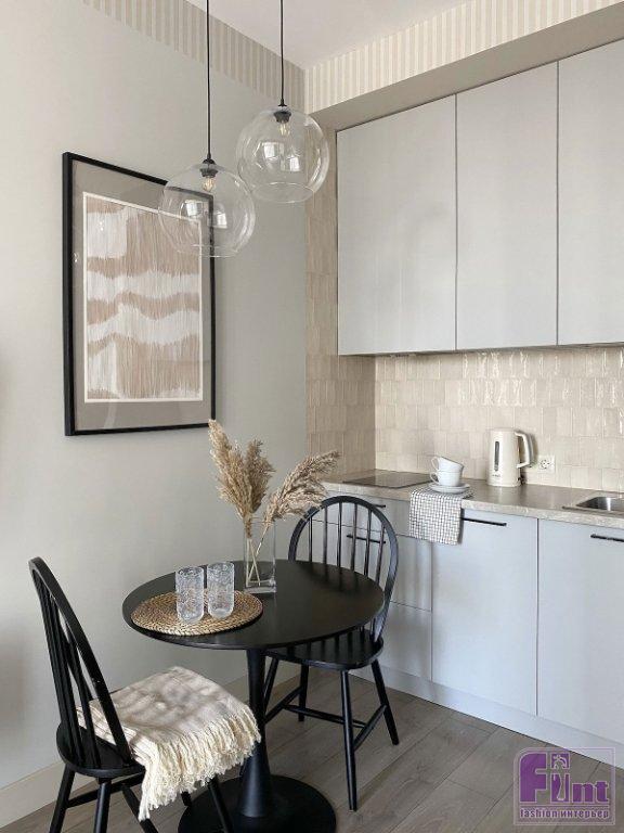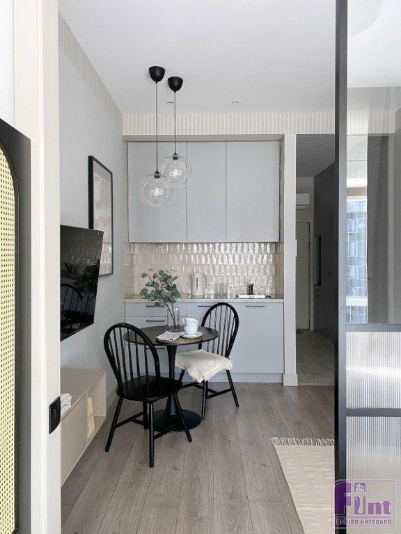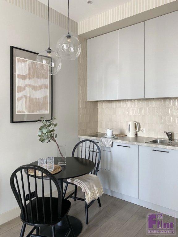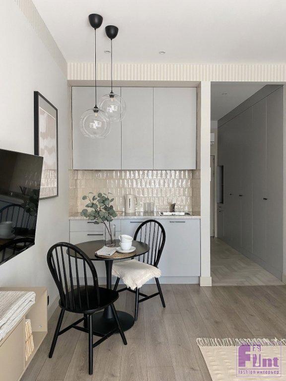 Это инвестиционная квартира — хозяева приобрели её для сдачи в долгосрочную аренду, а для оформления интерьера пригласили дизайнера Ирину Сагун. «Требования были соответствующими: нейтральный интерьер, рассчитанным на широкий круг арендаторов: износостойкий и ремонтопригодный. При этом студия должна быть хорошо укомплектована, выглядеть красиво и модно», — комментирует задачу Ирина.