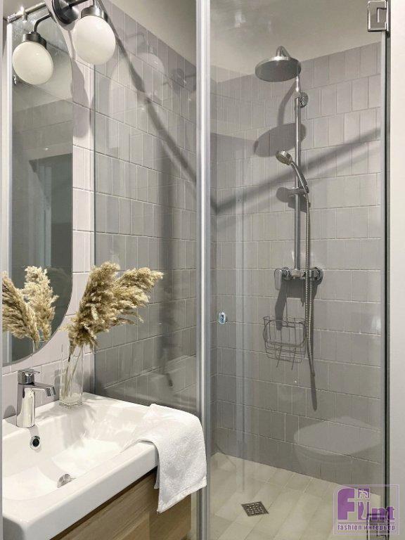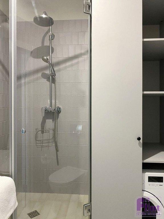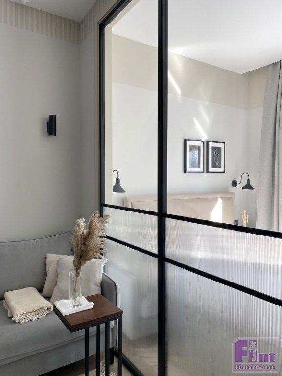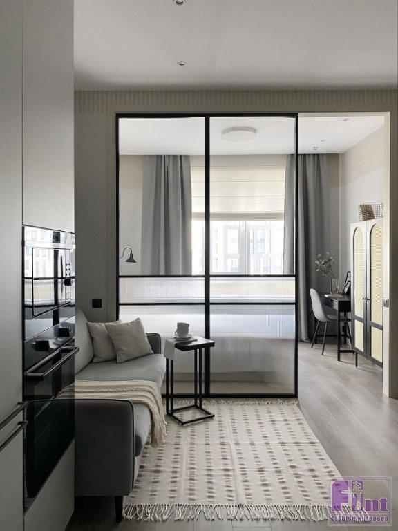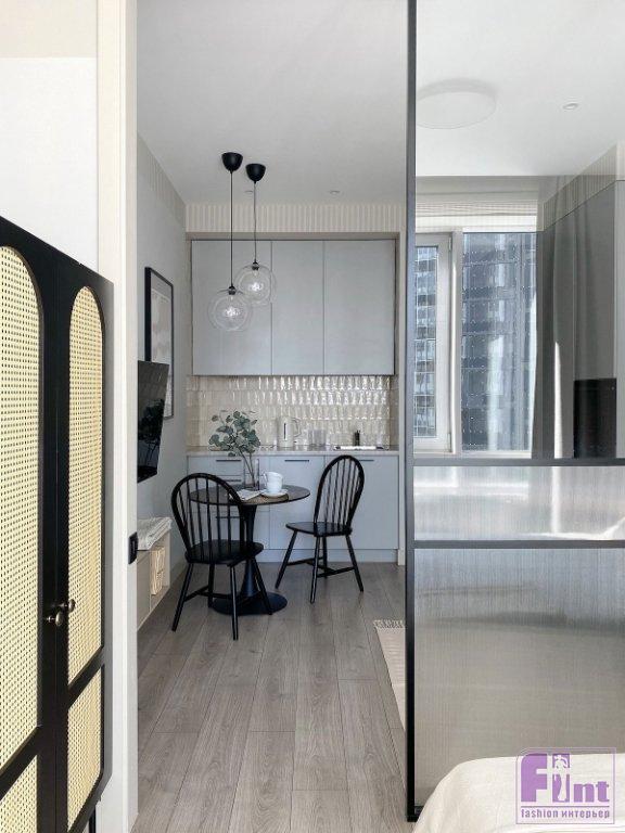 Вытянутая студия сдавалась застройщиком с перегородками санузла, дизайнер предложила разделить площадь комнаты, чтобы сделать изолированную спальню. Приватную зону спальни оборудовали у окна и закрыли раздвижной стеклянной перегородкой. Так естественный свет попадает в остальную часть квартиры. Кухню сделали очень компактной, а также уместили маленькую гостиную зону. Поэтому в студии получилось создать функционал двухкомнатной квартиры с отдельной спальней и гостиной.