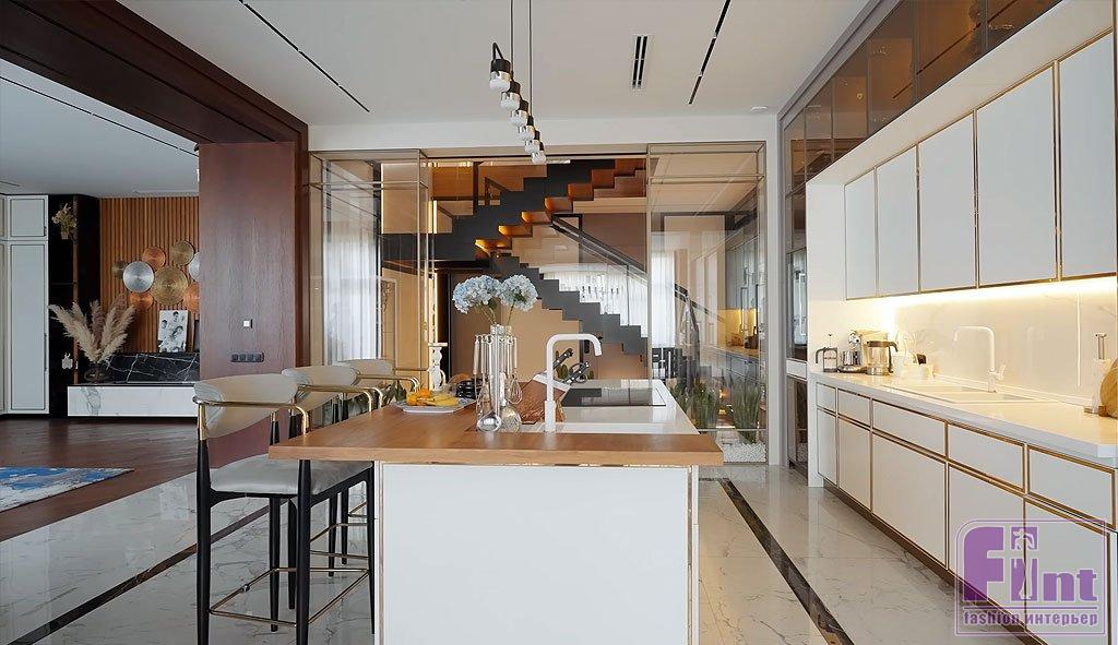 Первый этаж дома – это сердце повседневной жизни семьи. Кухня, обустроенная с любовью и заботой о каждой детали, включает кухонный остров и продуманную систему хранения. Удобство на кухне – один из главных приоритетов Сони, ведь она, несмотря на отсутствие страсти к готовке, создала идеальные условия для приготовления пищи. Особое внимание привлекает плита с выдвигающейся вытяжкой, которая эффективно устраняет запахи, сохраняя чистоту воздуха в большом пространстве кухни и гостиной. Гостевой туалет на первом этаже – настоящая жемчужина дома, благодаря изогнутым мраморным стенам и необычной раковине. На втором этаже расположены пять спален, включая спальню родителей с отдельной гардеробной и просторной ванной комнатой.