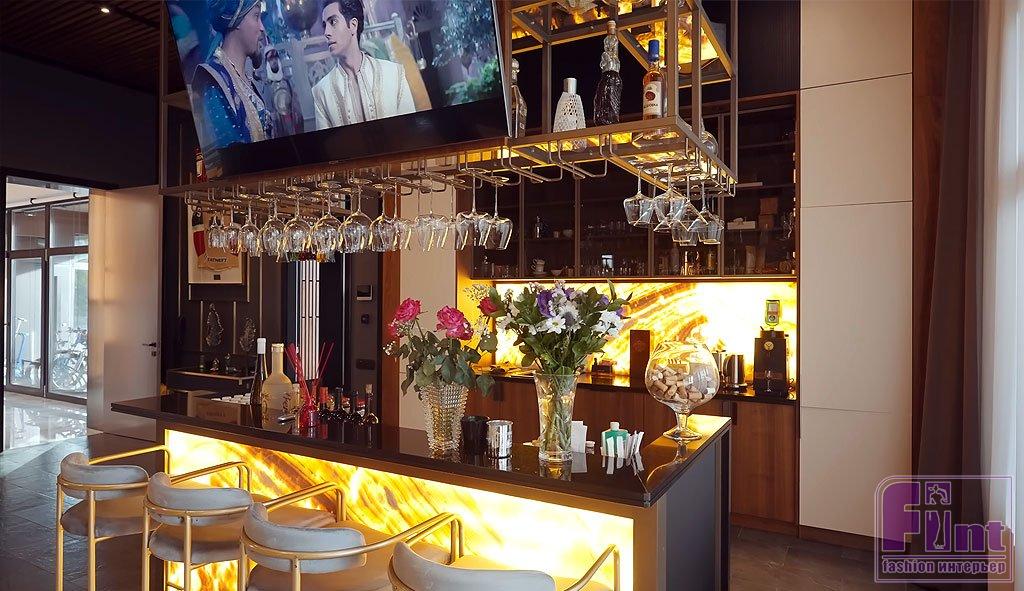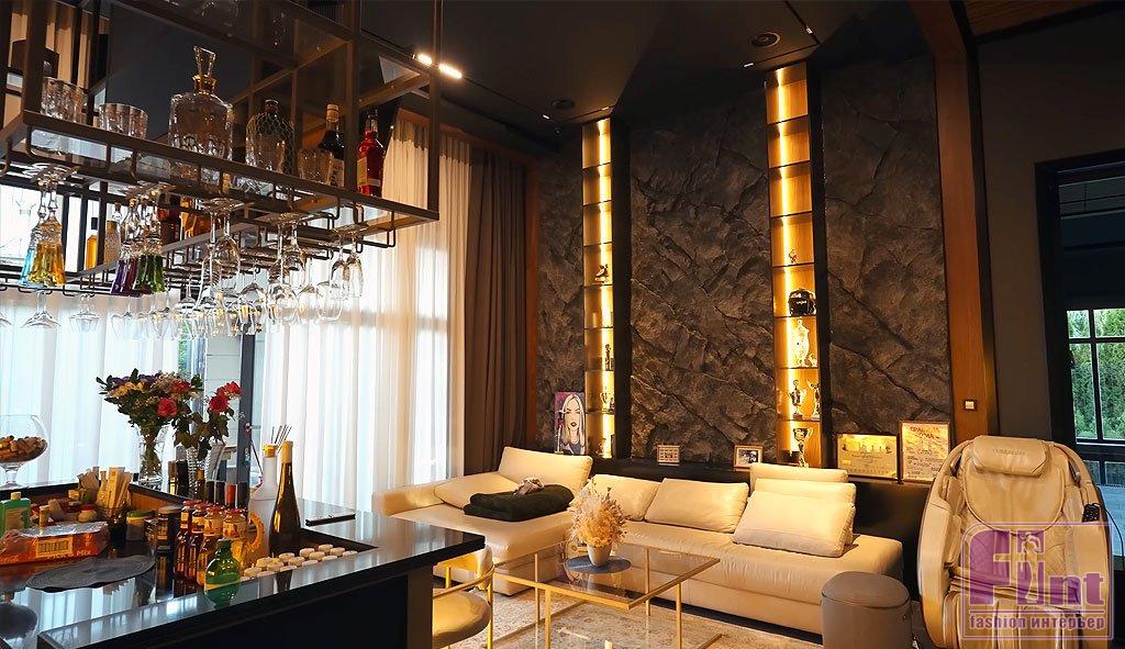 Гардеробная Сони – настоящая мечта каждой женщины, с тщательно продуманной системой хранения обуви и одежды. Но особое внимание заслуживает зона отдыха, где семья проводит вечера, смотрит фильмы и встречает гостей. Стена, имитирующая скалу, и барная стойка из оникса создают атмосферу уюта и роскоши. А ещё на приусадебном участке Марковых расположена летняя терраса с русской баней и мангалом – идеальное место для отдыха и общения на свежем воздухе и самая настоящая хоккейная площадка под огромным навесом!