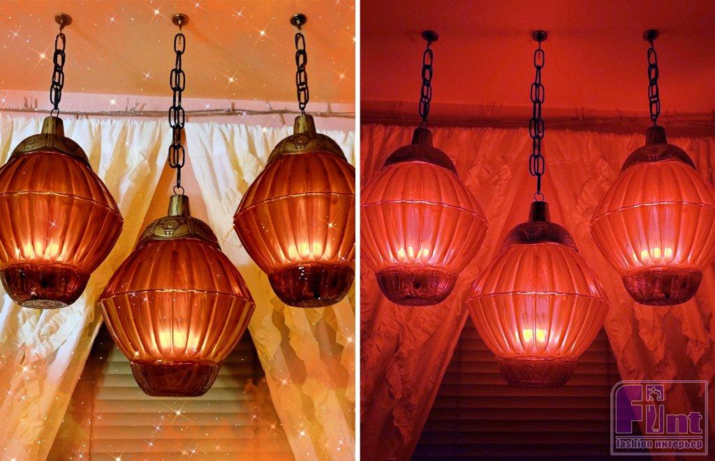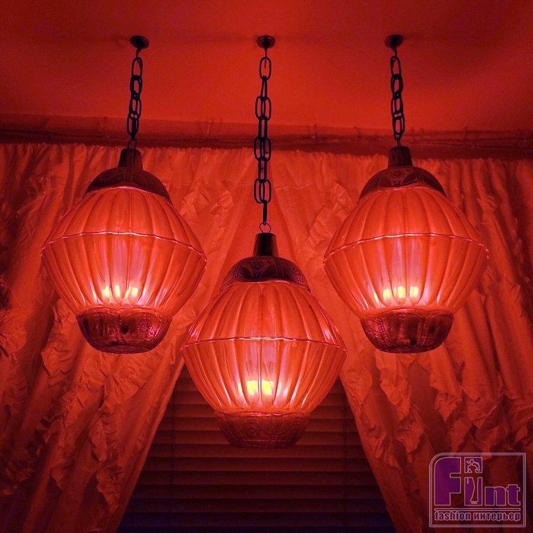 Прикрепите металлические цепочки к верхушкам ламп, повесьте их на крючки, которые вделаны в потолок, и включите свет с помощью пульта дистанционного управления источники света. Несмотря на то, что этот выглядит немного сложным, на самом деле он довольно прост, несмотря на довольно длинную инструкцию. Всё, что вам нужно – это просто сложить две окрашенные миски и получить форму красивого светильника в марокканском стиле. Единственной сложностью может стать поиск беспроводной подсветки, но такие светильники с небольшим пультом управления сегодня можно без труда найти на крупных маркетплейсах по ценам не дороже 500-600 рублей за комплект из трёх светильников с пультом для них.