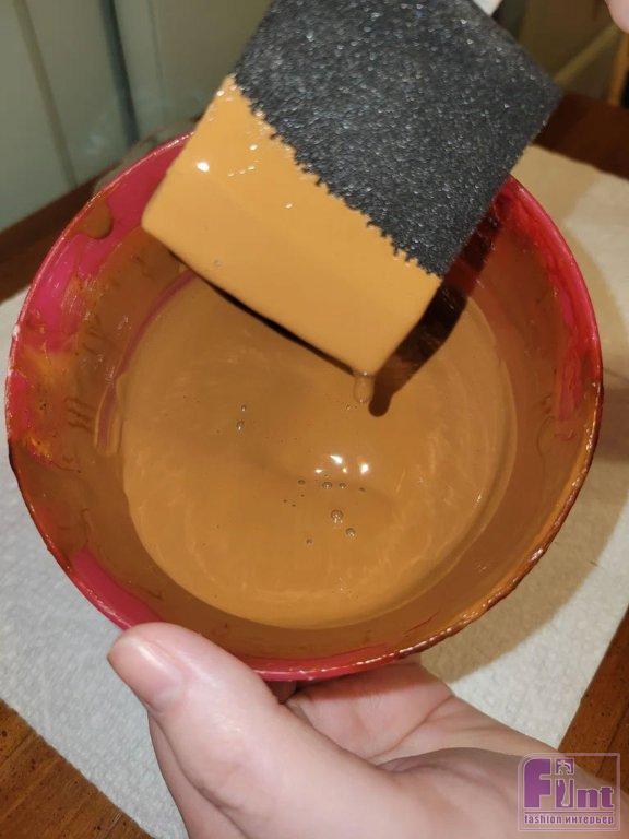 После того как вы соберете всё необходимое, для начала возьмите ненужную большую ёмкость и налейте в нее примерно полстакана глянцевого лака для декупажа. Затем постепенно добавляйте капли красного и жёлтого пищевых красителей, время от времени добавляя немного зелёного. Необходимо добиться, чтобы цвет был тёмного оттенка терракоты. Это самый важный шаг, если вы хотите, чтобы ваши светильники после высыхания приобрели нужный янтарный цвет. Поэтому ориентируйтесь на обычный глиняный горшок для растений, чтобы получить представление о цвете.