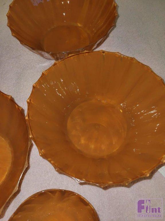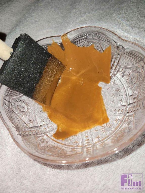 После того как вы тщательно перемешаете лак с красителями, используйте поролоновую кисть и нанесите краску на внутреннюю поверхность 6 больших и 3 маленьких декоративных мисок. Слой должен быть толстым. Проверить его толщину можно, посмотрев на окрашенную миску на свет. Если вы поднесёте миску к свету и увидите, что слой краски получается полосатым, не волнуйтесь! Готовое изделие с высохшей краской при включённом свете будет выглядеть иначе. Тем не менее тщательно следите за тем, чтобы слой краски, по возможности, был ровным и густым. Дайте мискам полностью высохнуть несколько дней, и вы заметите, что они приобрели чистый оранжево-янтарный цвет. Переходим к следующему шагу.