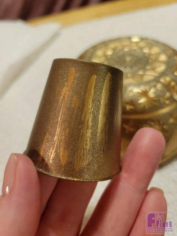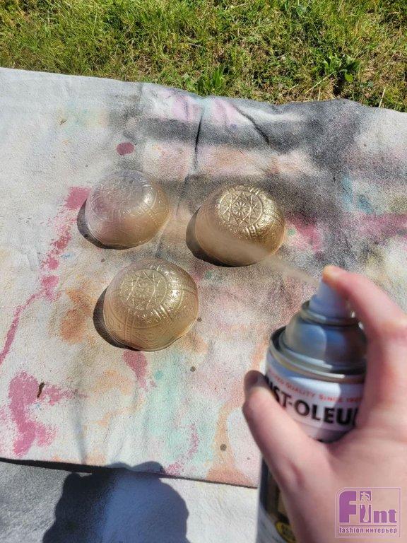 Используйте аэрозольную металлизированную краску цвета латуни и покрасьте снаружи 3 маленькие декоративные чаши и 3 пластиковые рюмки. Чтобы пластиковые рюмки не сдвинулись от напора краски из баллона, закрепите их на поверхности любым способом (можно накрыть ими что-то тяжёлое или подвесить, насадив на палочку). Дайте изделиям полностью высохнуть.