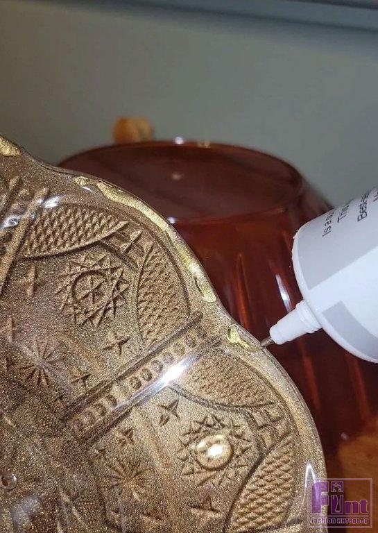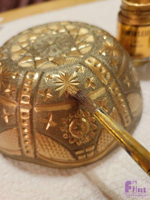 Затем возьмите кисть для рисования и очень лёгкими движениями нанесите штрихи краской с позолотой на выступающие части посуды. Это сделает детали более заметными, и чаши будут выглядеть так, как будто они сделаны из латуни, но рельефные детали со временем отполировались. Для декорирования рюмок используйте кисть и слегка проведите по ним вертикальными линиями краски с позолотой. Дайте этим чашам и рюмкам высохнуть в течение как минимум одного дня.