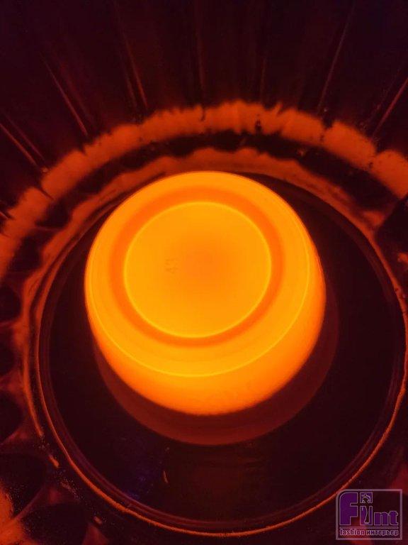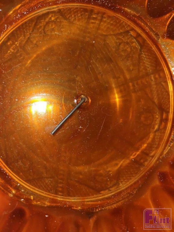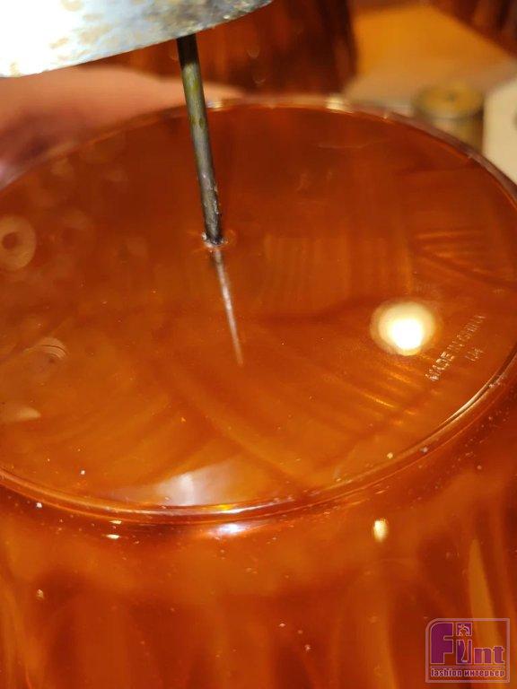 Пока ваши изделия, задекорированные под латунь, сохнут, вы можете поработать над мисками оранжевого янтарного цвета. Переверните 3 большие миски, окрашенные в оранжевый цвет, на огнеупорную рабочую поверхность так, чтобы они были обращены донышками вверх. Теперь наденьте защитные перчатки и очки и с помощью металлических плоскогубцев подержите гвоздь над открытым пламенем около 30 секунд. Быстро и очень осторожно проткните раскалённым гвоздём центр дна больших мисок, пока не получите ровное отверстие, затем выньте гвоздь и подождите, пока он остынет, прежде чем класть его на что-либо. Теперь у вас есть 3 отверстия в нижней части трёх больших мисок.