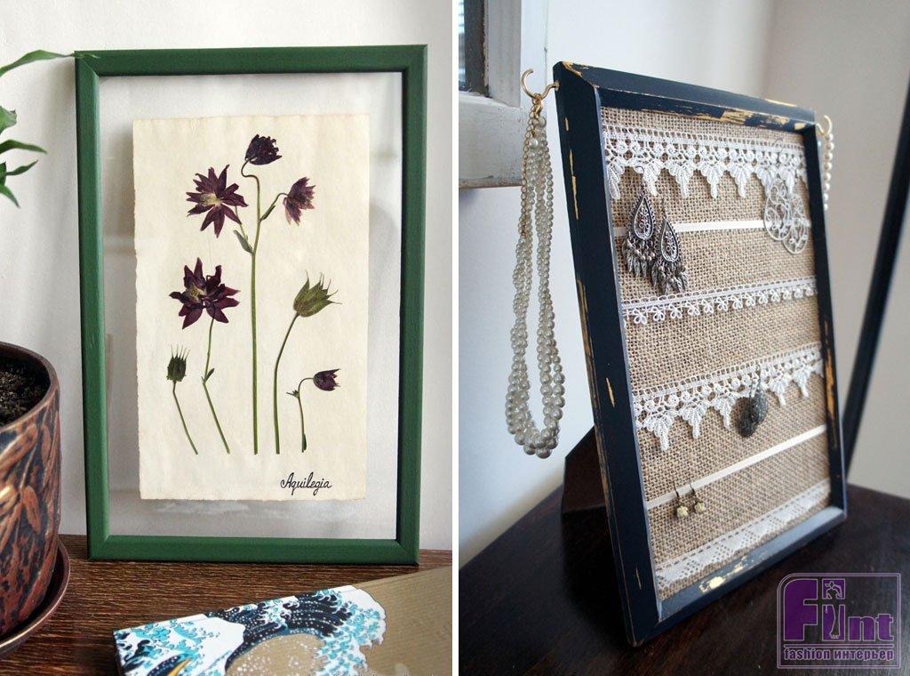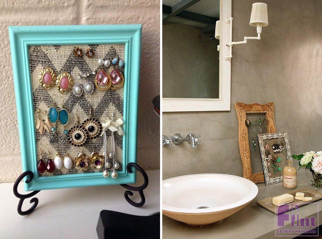 Рамки могут быть не просто красивыми, но и функциональными. Например, если превратить их в органайзеры для украшений, заменив стекло лесками, бечёвкой или мелкой сеткой. На них удобно вешать серёжки, броши и даже кольца, если снабдить натянутые нити небольшими крючками. Поставьте такую рамочку в спальню или ванную комнату, а для большего декоративного эффекта составьте композицию из 2-3 штук разного размера для разных типов украшений.