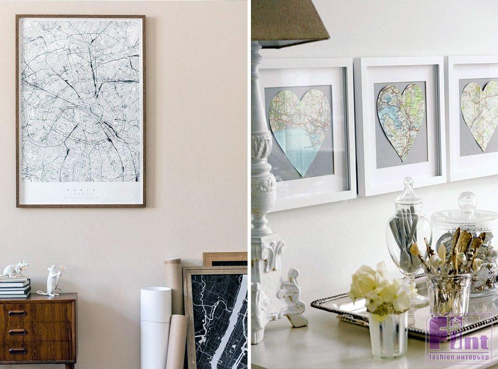 Географические карты впишутся в любой стиль. А ещё их можно обыграть десятками способов. Например, для классического или винтажного интерьера подойдут старинные изображения. Для минимализма, контемпорари, скандии — графичные чёрно-белые планы города или станций метро. Для бохо или экостиля — красочная карта мира. Можно фрагментировать изображение и создать композицию из 2-3 фрагментов. Или подобрать стилизованное изображение карты: например, в духе карандашного скетча.