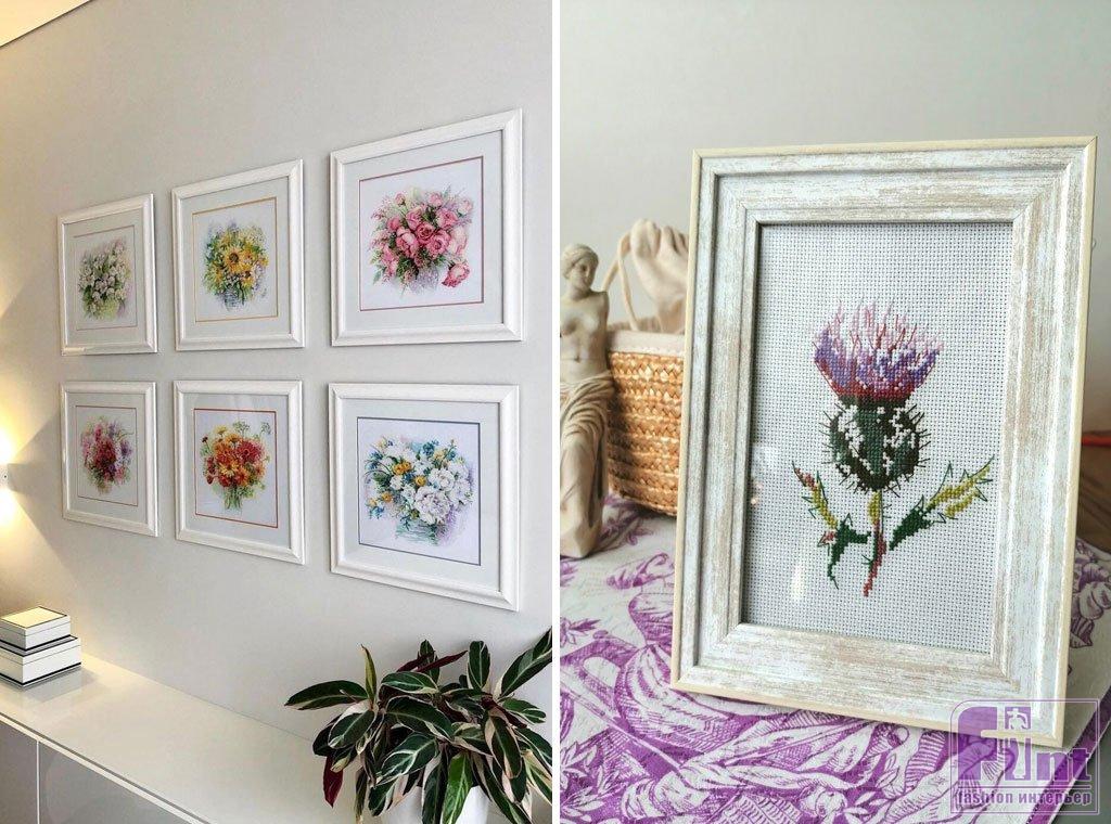 Если вы увлекаетесь вышиванием или кто-то из близких периодически дарит сам свои работы, их можно превратить в полноценный декоративный элемент. Подберите подходящие по стилю рамки и повесьте на стены так же как картины. Занимаетесь вышивкой сами? Создайте несколько сюжетных полотен: например, натюрморт для кухни и красивые природные пейзажи для других комнат.