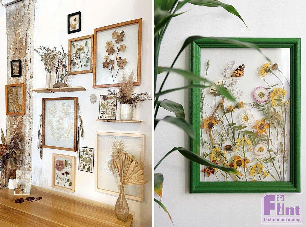 Гербарий — это не только типичное осеннее задание в начальной школе, но и замечательное украшение для дома. Природную картину легко сделать самостоятельно: понадобятся только рамка, клей и сами растения. Это могут быть цветы, листья, тонкие веточки. Их нужно просушить, зафиксировать на поверхности клеем и вставить в рамку. Её можно покрасить в тон засушенным растениям, или оставить естественного цвета. А для минималистичного интерьера подойдёт тонкое чёрное или белое обрамление.