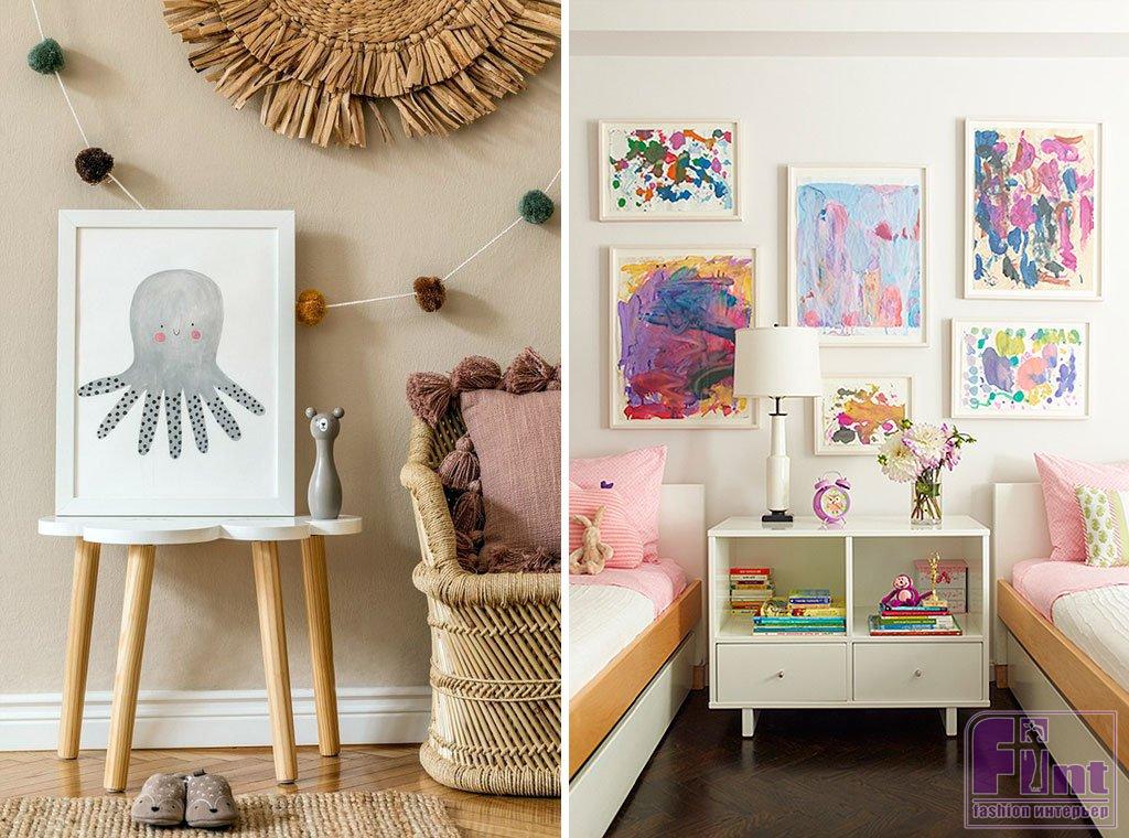 Творчество детей можно не только хранить в альбомах и папках, но и включить в интерьер. Но в парадной гостиной или столовой забавные каракули могут смотреться нелепо, а вот в детской станут органичной частью общего дизайна. Отберите вместе с «автором» 2-3 самых удачных рисунка или аппликации, подберите для них рамки в одном стиле и украсьте этим творчеством комнату. Будет приятно и вам, и ребёнку.