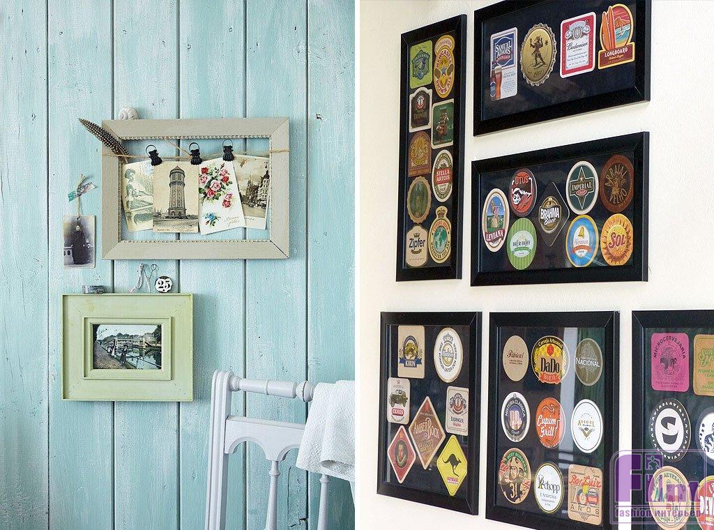 Под стеклом удобно хранить памятные открытки из путешествий. Или поступить иначе, натянув, как в предыдущем совете, нити поперёк рамки. Можно подобрать рамку покрупнее, удалить из неё стекло, а старые фото и открытки закрепить сувенирными прищепками на натянутой бечёвке. Получится атмосферно и необычно. Но стандартный вариант с размещением открыток за стеклом тоже вполне подойдёт. Кстати, вместо открыток можно использовать яркие и необычные бирдекели (подставки под пивные кружки), которые вы или ваши знакомые привезли из путешествий. Они, как и открытки, могут пробуждать массу приятных воспоминаний о посещённых странах и городах.