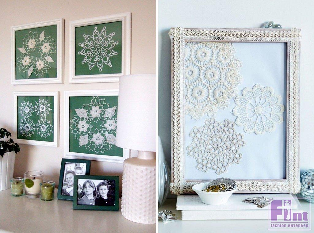 В картину можно превратить не только остатки обоев, но и, например, ткань. Особенно выразительно смотрится кружево: деликатное плетение хочется рассматривать, оно притягивает взгляд, несмотря на отсутствие яркого цвета или пёстрого узора. Поместите под стекло что угодно: отрез старой скатерти, салфетку, часть бабушкиного приданого. Здорово, если у изделия будет настоящая история, связанная с квартирой или вашей семьей. Так получится ещё атмосфернее. Лучше всего для такого декора подходят обычные круглые кружевные салфетки, но даже старинный кружевной воротничок прекрасно украсит собой ваш интерьер.