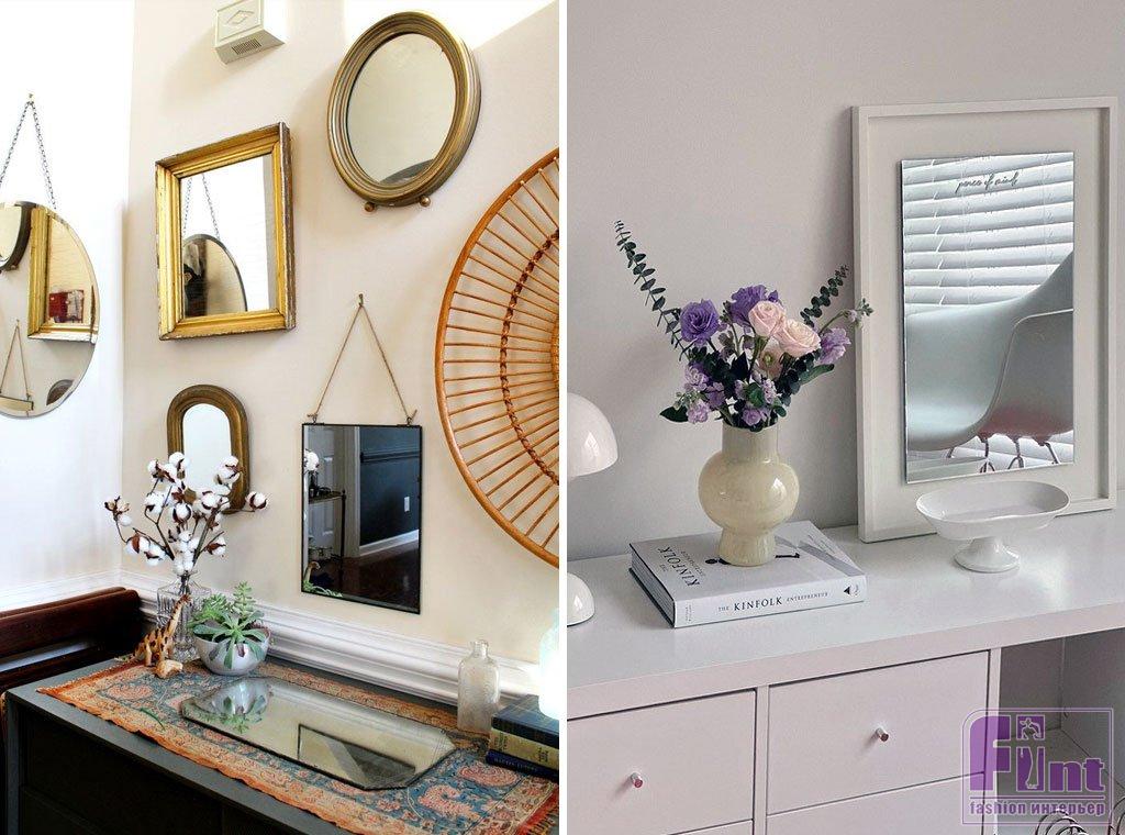 Обычное зеркало в раме можно обыграть по-новому. Например, если поместить небольшое зеркало в раму большего размера без стекла. В этом случае за счёт свободного пространства по периметру зеркального полотна создается ощущение, что это не функциональный аксессуар, а картина. И в каком-то смысле зеркало здесь становится художественным произведением — но не статичным, а отражающим то, что происходит в комнате.
