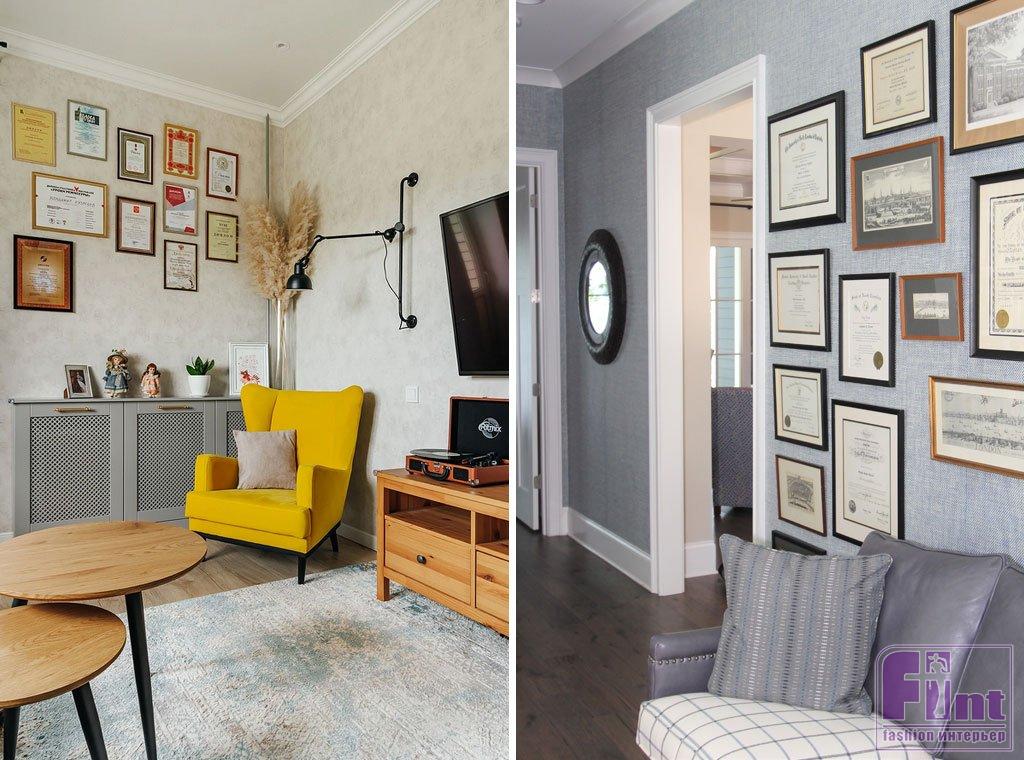Если у вас или членов семьи много достижений, их не нужно прятать. Обрамите самые значимые грамоты, сертификаты, благодарственные письма и создайте целую «стену славы». В зависимости от общего стиля все рамки могут быть лаконичными, почти одинаковыми, или разного размера, цвета, фактуры. Такой способ декора можно часто увидеть в зарубежных фильмах и сериалах, когда действие происходит в кабинете юриста или врача. Но и для жилого помещения такой декор будет интересным и необычным.
