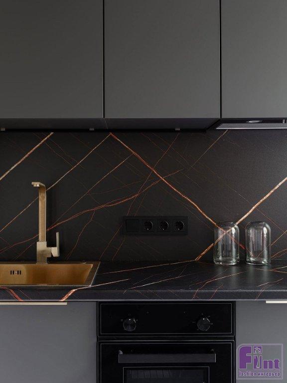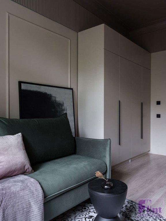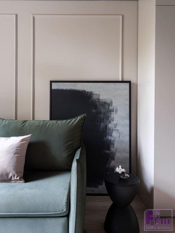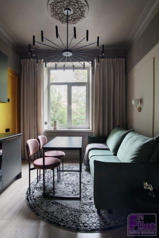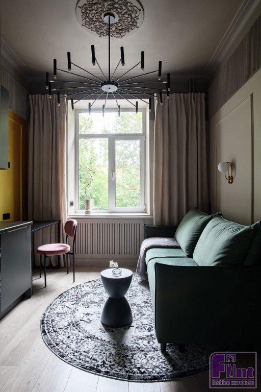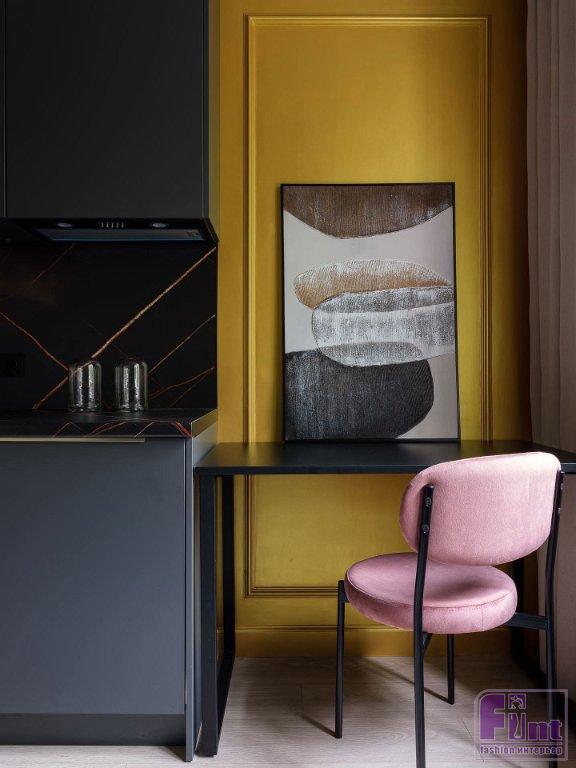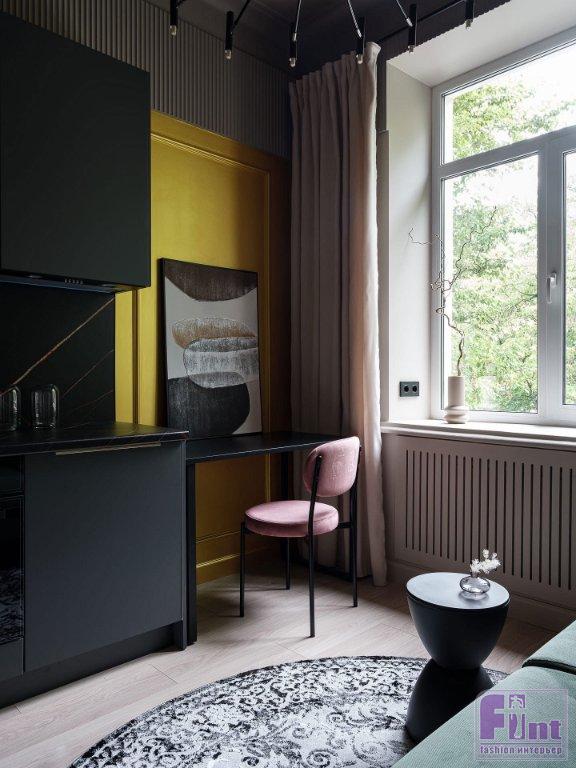 Для стен использовали светлую краску в качестве фона и золотую эмаль в зоне стола рядом с кухней. Высокий потолок в таком маленьком пространстве требовалось как-то обыграть. Для этого дизайнеры выбрали тёмный цвет и сделали фриз с помощью 3D-панелей на стене в том же оттенке. Молдинги и лепная розетка на потолке намекают на классику, что при общем современном стиле тоже выглядит интересно. «Мы хотели недорогим способом украсить квартиру — лепнина отлично справляется с этой задачей. Очень здорово, что в этой квартире сохранилась оригинальная лепнина по периметру потолка, мы её оставили, как и красивые глубокие подоконники», — отмечают авторы проекта.
