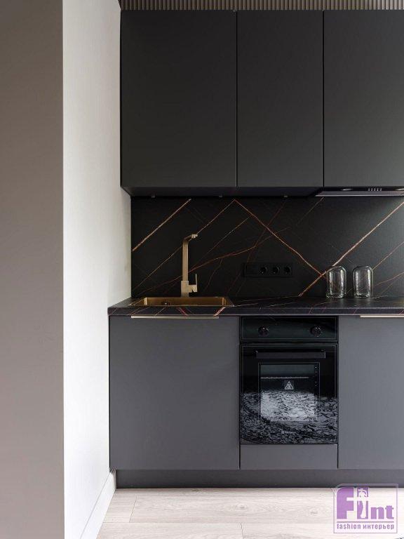 В квартире один вместительный шкаф высотой ровно по стенам санузла. Кухня компактная, но с необходимой техникой, включая мини-холодильник, встроенный в нижний шкаф, духовой шкаф и вытяжку. Варочная поверхность переносная, её при необходимости можно достать, а потом спрятать, чтобы освободить больше пространства на рабочей поверхности. Стол, который стоит у окна, может использоваться как рабочий или обеденный — его легко выдвинуть в центр комнаты, если придут гости. Диван — раскладной.