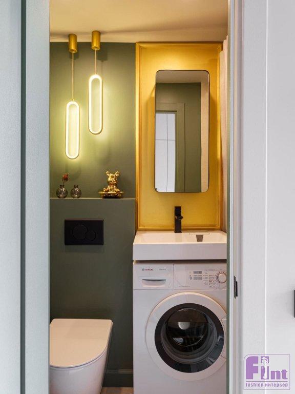 «Мы хотели сделать проект универсальным по цвету для любого будущего жителя, но при этом добавить акцент. Нам кажется, что у нас получился классный акцент с золотой стеной — она придаёт комнате шика. Основной тон — спокойный, бежевый, но мы не стали делать стандартно белый потолок, он на два тона темнее стен. Санузел выделили зелёным, который сочетается с цветом дивана в основной зоне. Мы постарались создать интерьер с вау-эффектом, но в котором будет комфортно жить и находиться каждый день», — рассказывают о проекте Александра и Татьяна.