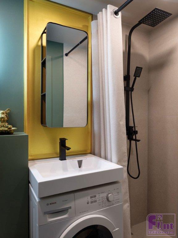 В маленькой душевой стиральную машину установили под раковину, это специальная раковина, подходящая для такого способа монтажа. Зеркало выбрали с полками, которые конструктивно спрятаны за зеркальным полотном. К полкам удобно дотянуться и из душевой. Шкаф над инсталляцией унитаза решили не делать, чтобы не загромождать пространство.