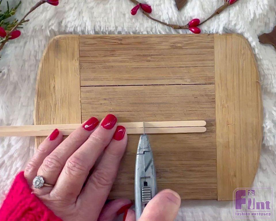 С помощью острого ножа отрежьте 24 кусочка длиной около 5-6 см от деревянных палочек для перемешивания напитков. Закругленные края станут кончиками наших лыж.