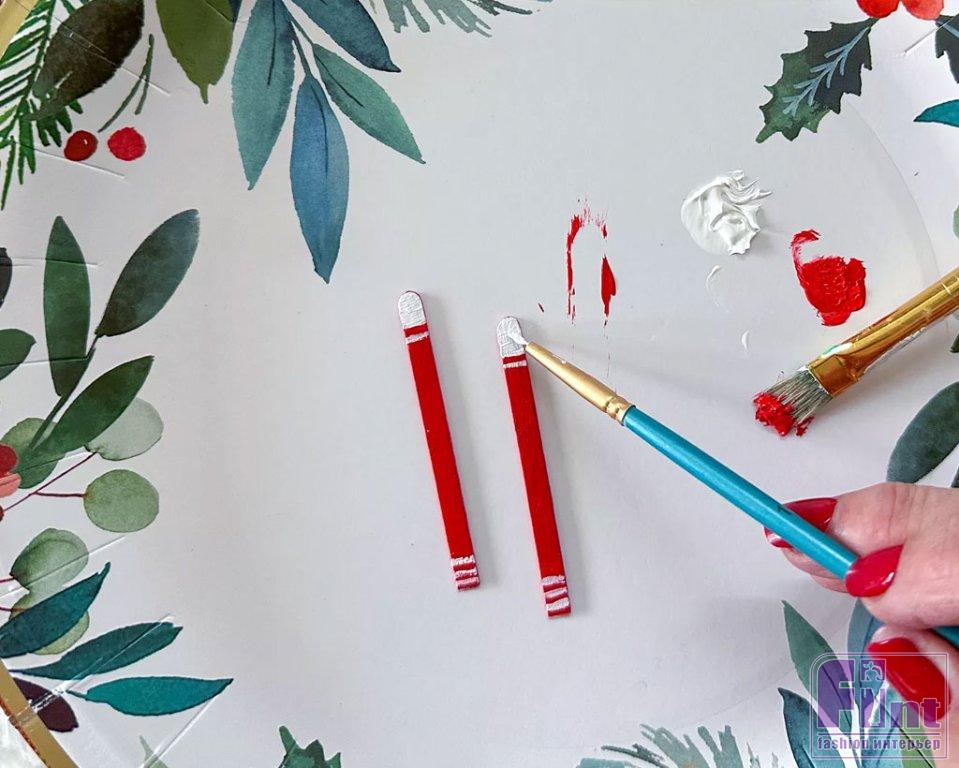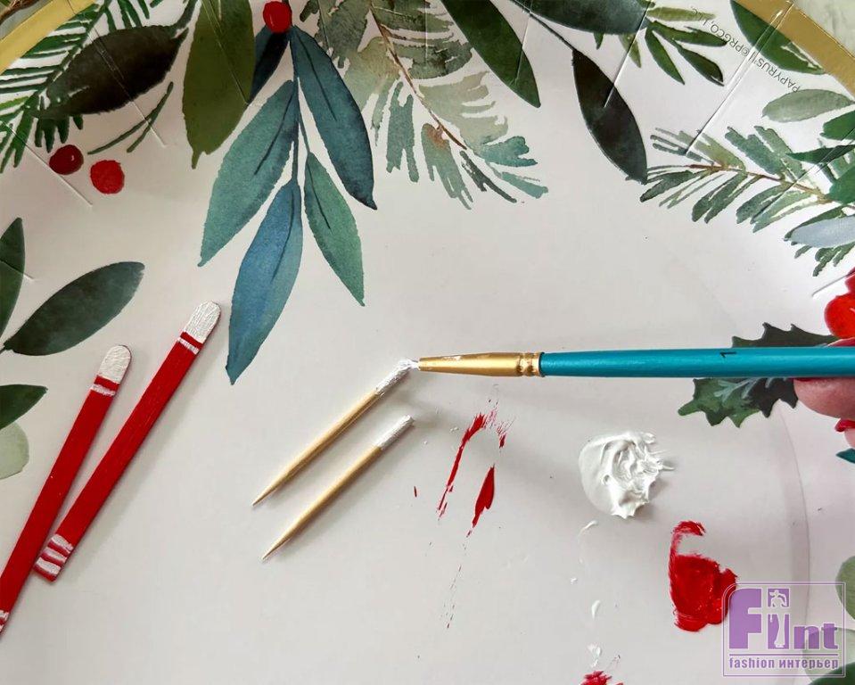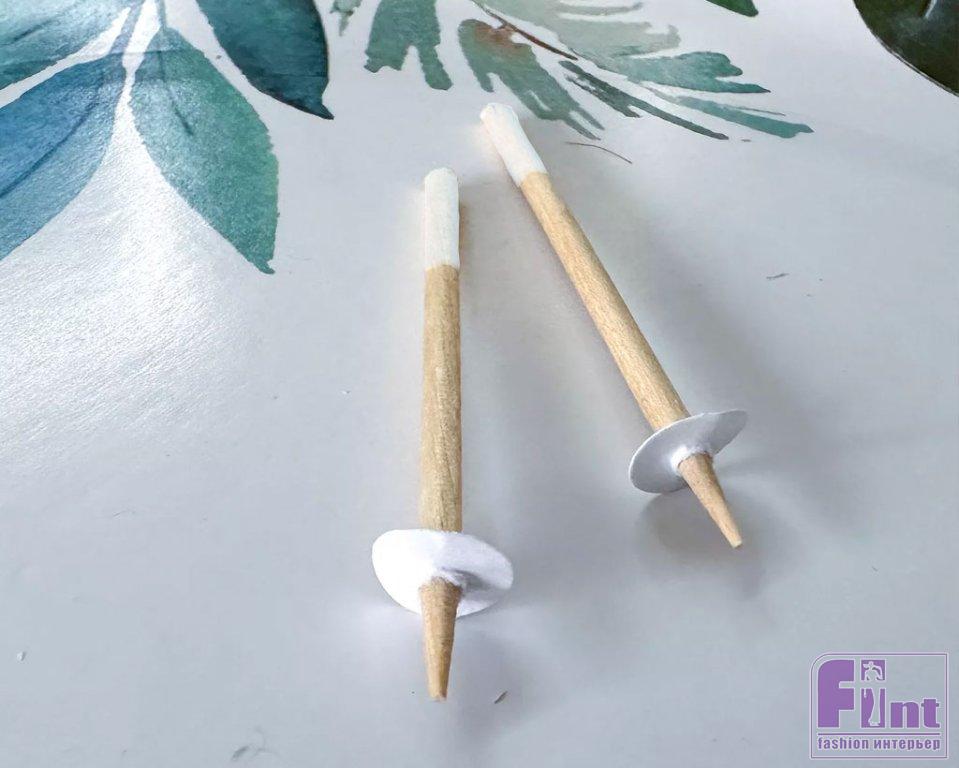 Раскрасьте верхушки палок белой краской, чтобы они изображали ручки, а затем наденьте на острый кончик зубочистки кружок из белой бумаги, который высекает обычный канцелярский дырокол. Если дырокола под рукой нет, просто вырежьте круглые конфетти нужного размера ножницами. Пара лыжных палок готова!