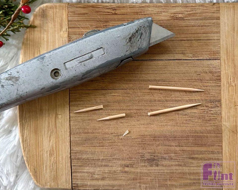 Отрежьте 24 зубочистки длиной около 4,5 см острым ножом, чтобы превратить зубочистки в заготовки для старинных лыжных палок.