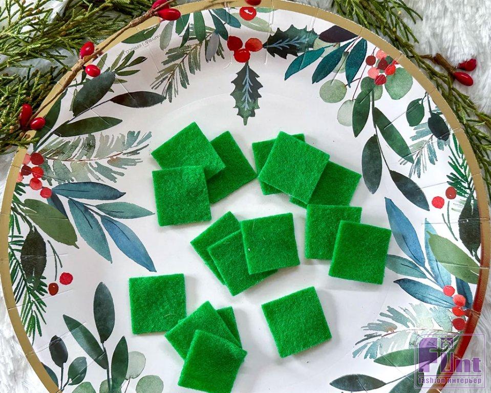 Вам понадобится 64 квадратных кусочка фетра со стороной около 3 сантиметров. Мы использовали фетр ярко-зелёного цвета, но вы можете подобрать свой цвет фетра, который вам больше нравится, или который есть у вас под рукой.