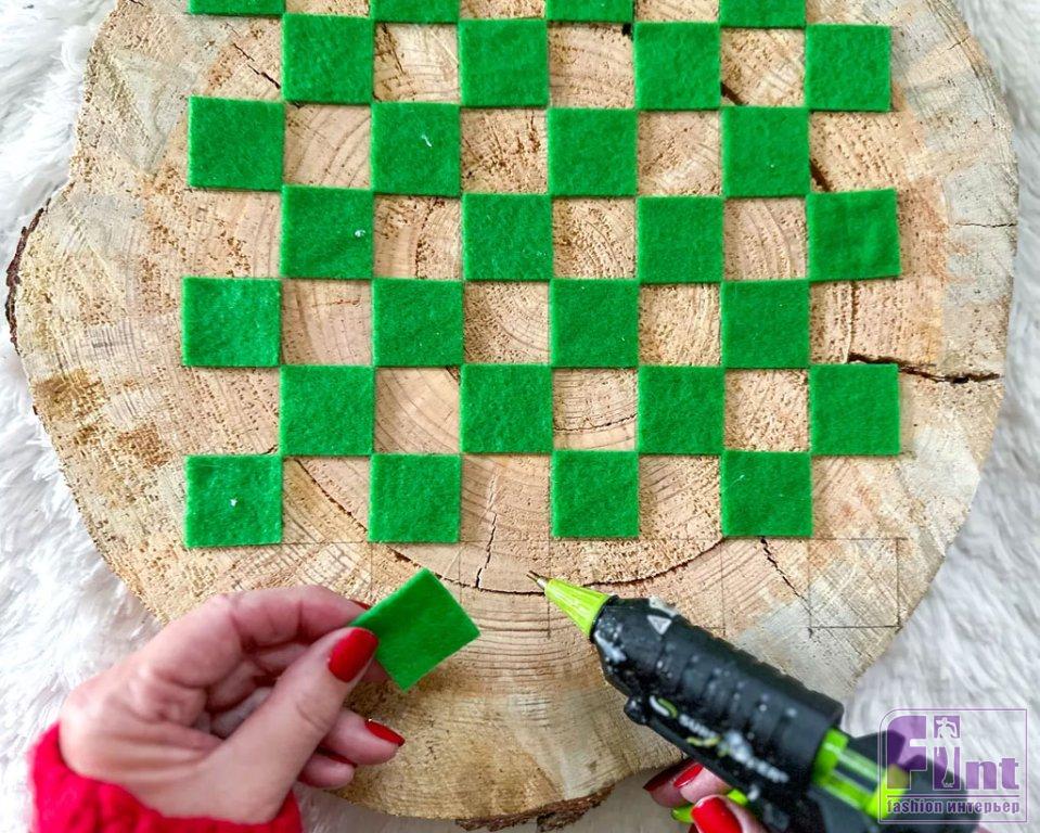 Затем выкладываем квадратики из фетра на деревянную подставку в классическом шахматном порядке и приклеиваем фетр горячим клеем. Если вы один из тех счастливчиков, у которых есть цепная пила и случайно завалялось несколько бревен, тогда смело режьте и шлифуйте их, чтобы получить такую подставку! Если нет, то подобные спилы нужного размера сейчас можно легко найти на популярных маркетплейсах по цене до 500-600 рублей.
