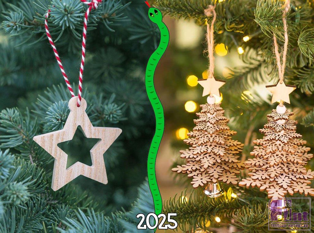 Поскольку Змея деревянная, желательно добавить украшения из этого натурального природного материала. Подойдут как покупные, так и самодельные игрушки. Например, несложно вырезать из дерева простую звёздочку. Также можно использовать миниатюрные спилы, просверлив в них отверстие для лески или ленточки. Получится интересное украшение в стиле рустик.