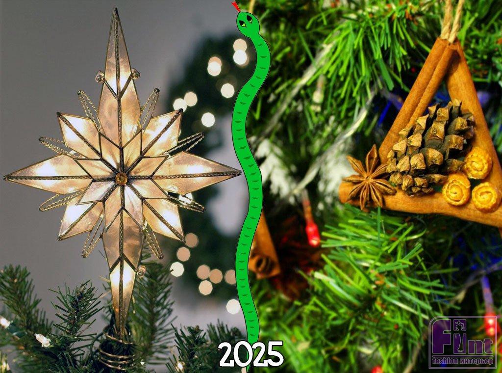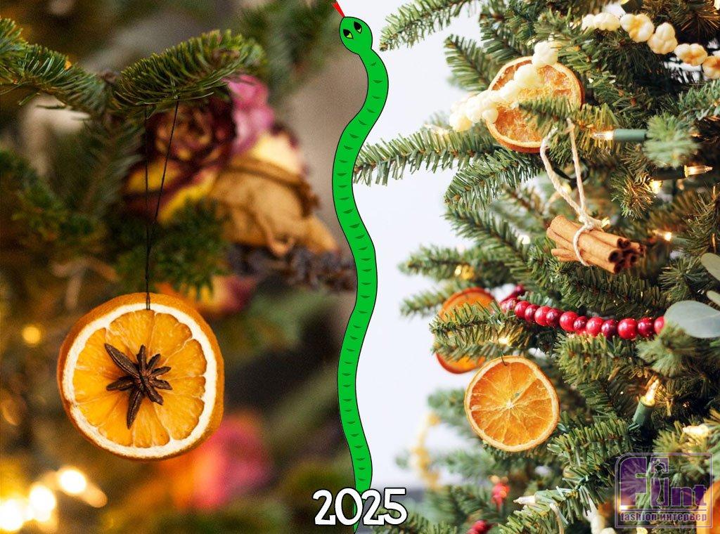 Поскольку Деревянная Змея любит всё природное, хорошим решением станет дополнить ёлку натуральным декором. Это могут быть шишки или каштаны из леса либо засушенные апельсины, веточки корицы, стабилизированные ягоды. Не забудьте про верхушку ёлки, ведь это главный акцент. Её можно украсить традиционной звездой, повесить красивый бант или выбрать наконечник в виде змеи. Главное, чтобы изделие не было слишком тяжелым, иначе ветка может накрениться, погнуться или вовсе сломаться. А украшение — упасть и повредиться.
