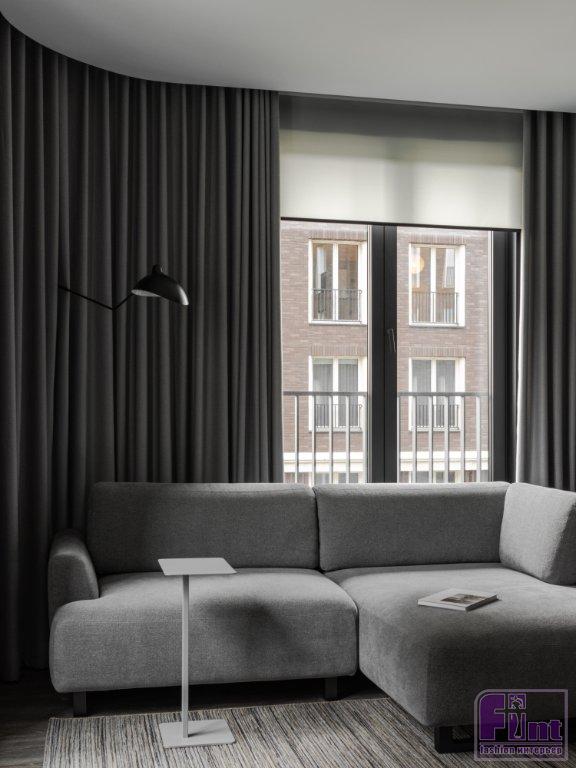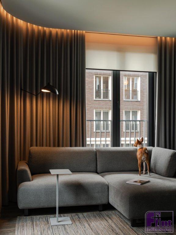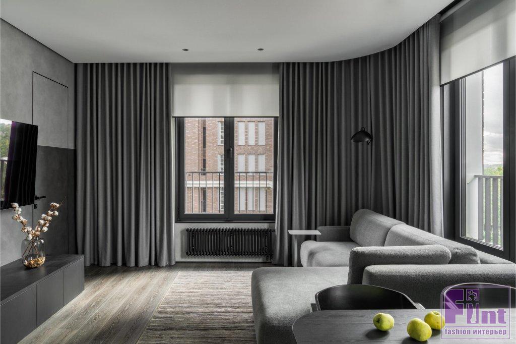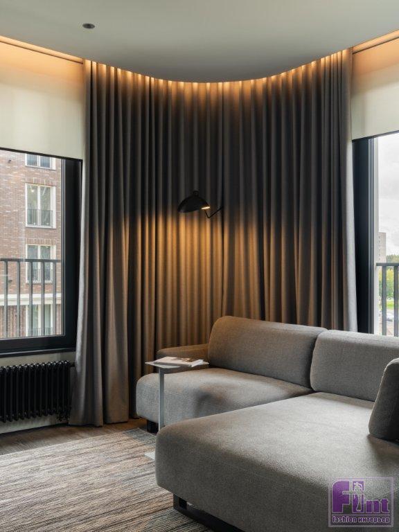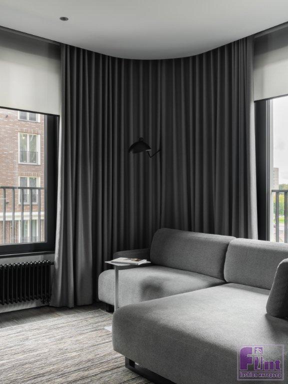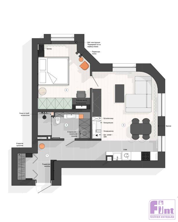 Дизайнер называет планировку удачной. Это объединённая кухня-гостиная, достаточно просторный санузел, отдельная спальня. Изменили только расположение входа в спальню из гостиной, сдвинув дверной проём. Особенностью планировки стали не очень удобные углы в гостиной и спальне. В гостиной вопрос решили с помощью отделки, штукатуркой закруглили угол. В спальне же обыграли его расстановкой мебели.
