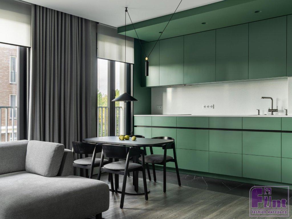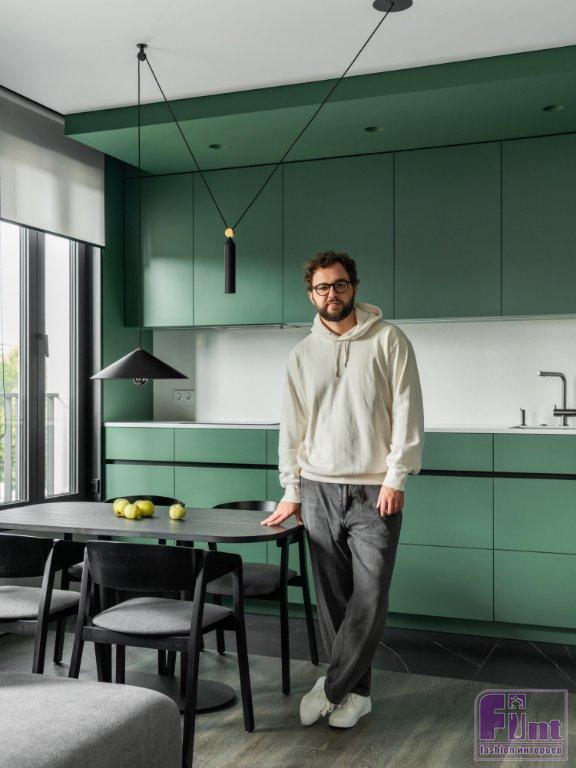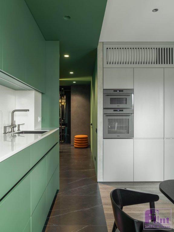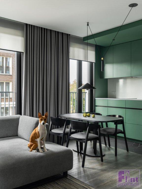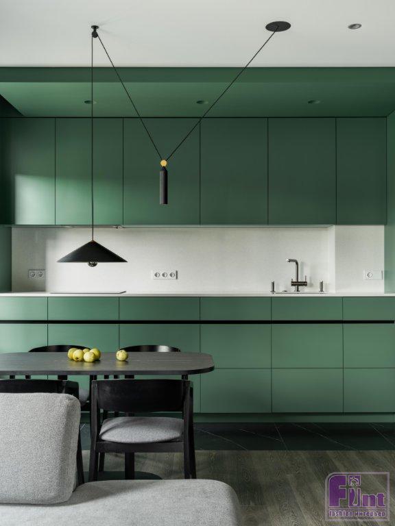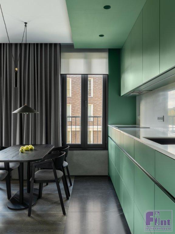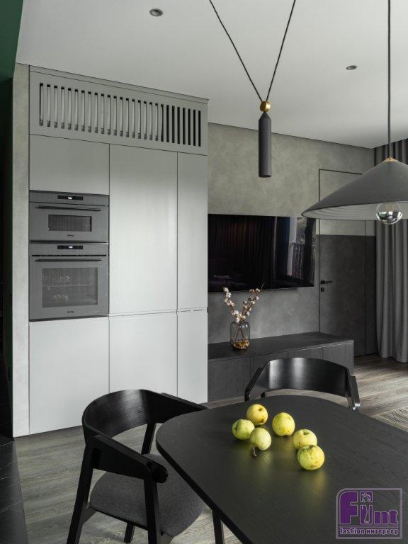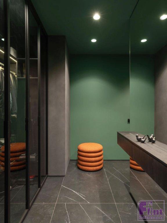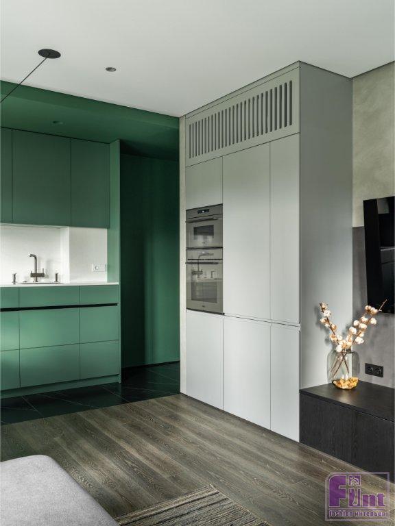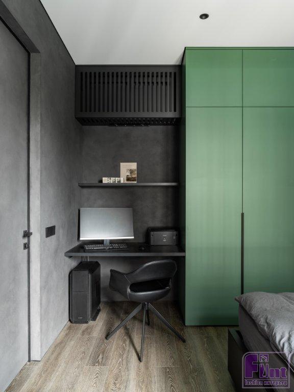 В отделке стен прихожей и спальни использовали краску насыщенного зелёного оттенка. В кухне-гостиной — декоративную штукатурку в оттенках серого под травертин. Именно сочетание зелёного и разных оттенков серого стало основой цветовой гаммы проекта. Зелёный плавно переходит из прихожей на кухню, где в этом цвете оформлен не только гарнитур, но и навесной потолок. Получился достаточно объёмный цветовой акцент. Терракотовые детали добавлены точечно, в виде декора и мелкой мебели.