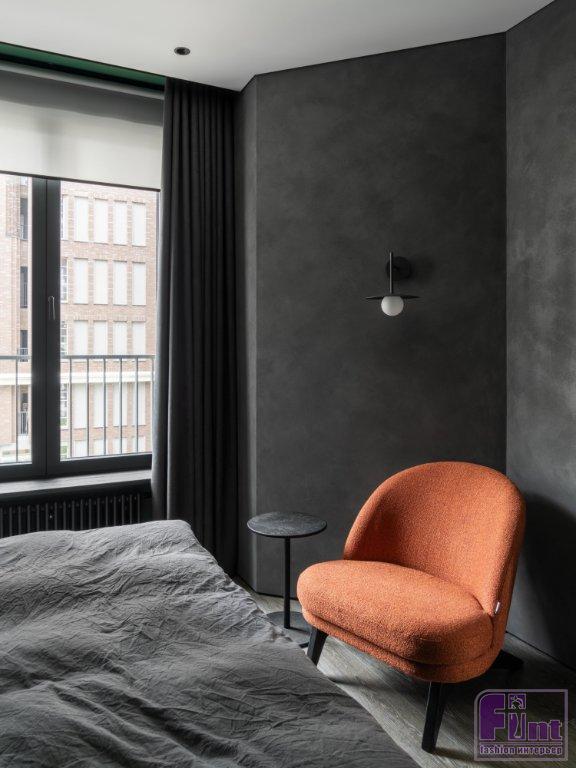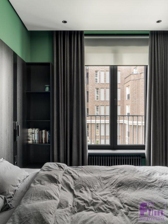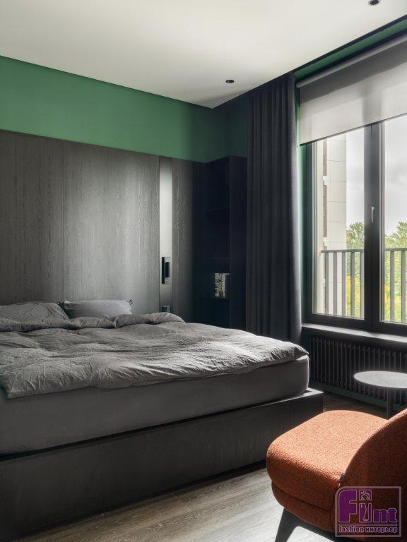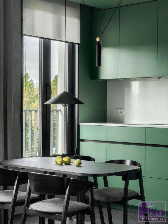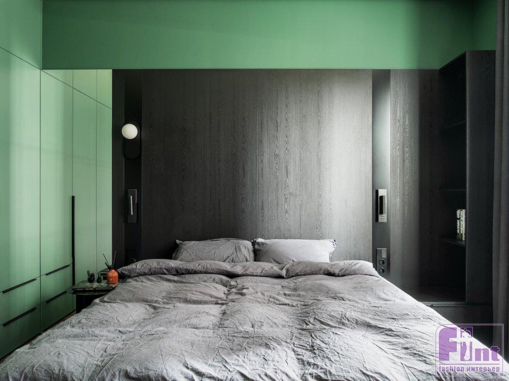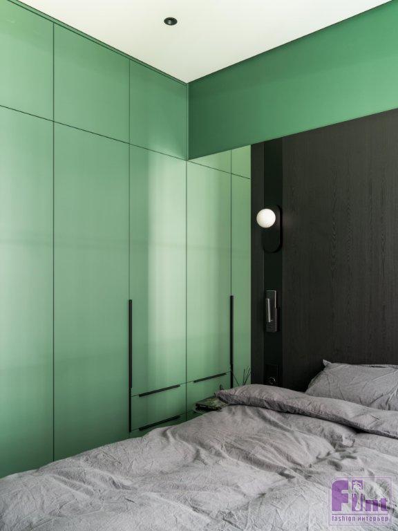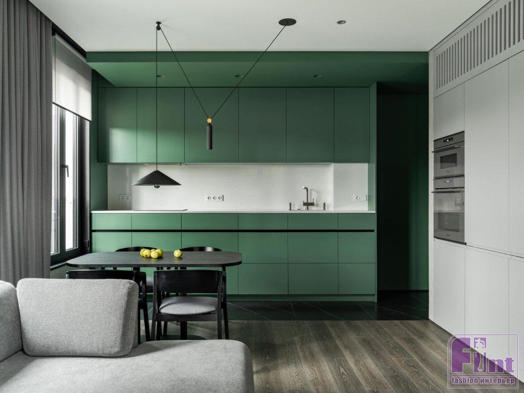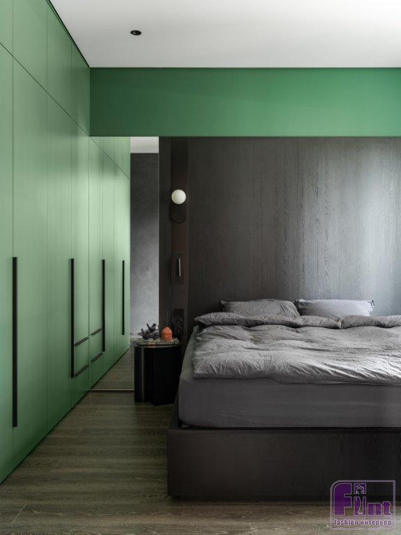 В отделке стен прихожей и спальни использовали краску насыщенного зелёного оттенка. В кухне-гостиной — декоративную штукатурку в оттенках серого под травертин. Именно сочетание зелёного и разных оттенков серого стало основой цветовой гаммы проекта. Зелёный плавно переходит из прихожей на кухню, где в этом цвете оформлен не только гарнитур, но и навесной потолок. Получился достаточно объёмный цветовой акцент. Терракотовые детали добавлены точечно, в виде декора и мелкой мебели.