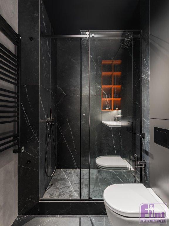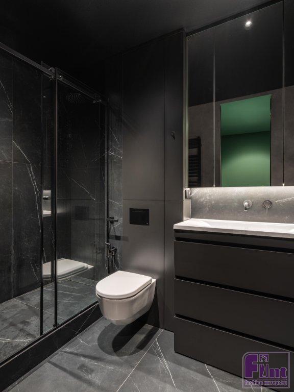 На пол уложили SPC-ламинат, в прихожей и зоне кухни — крупноформатный тёмный керамогранит. В ванной комнате тот же керамогранит использовали на полу и стенах душевой. Стена с дверью отделана декоративной штукатуркой, а остальные поверхности закрыты мебельными панелями. Потолок — натяжной тканевый с теневым профилем. А двери — скрытого монтажа. Это характерные черты для минимализма.