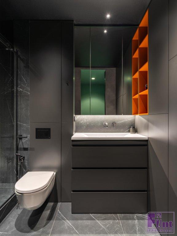 В ванной комнате — вместительный хозяйственный шкаф, где спрятаны стиральная и сушильная машины, а также разные нужные мелочи, запасы средств. Над унитазом — скрытый за дверцами доступ к коммуникациям. Кроме тумбы под раковину предусмотрен и подвесной шкафчик с зеркальными фасадами.