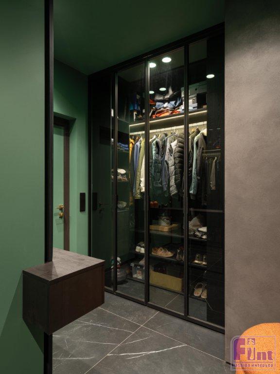 В квартире продуманы системы хранения для одежды и хозяйственных вещей. Первая — шкаф в прихожей. Его сделали со стеклянными дверями на манер гардеробной. Здесь хранится верхняя одежда, обувь, запланировано место для вертикального пылесоса, а также для разных вещей для собаки. Напротив шкафа — большое зеркало с подсветкой и консоль для мелочей. Терракотовый пуф — тоже место для хранения, его сидение легко снять, чтобы положить что-то внутрь.