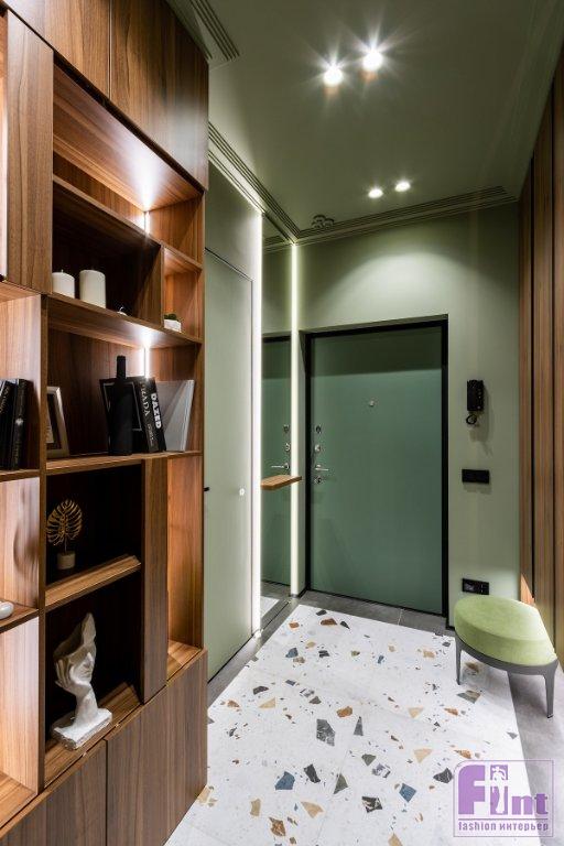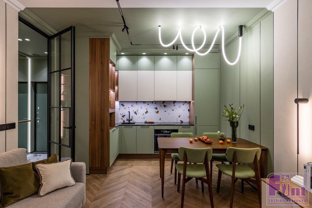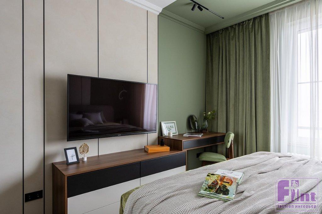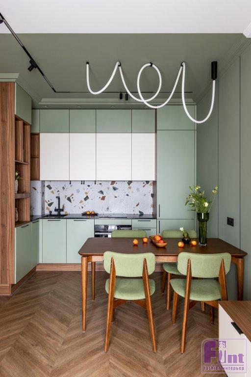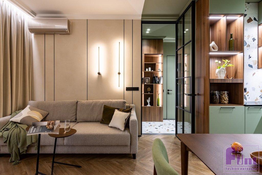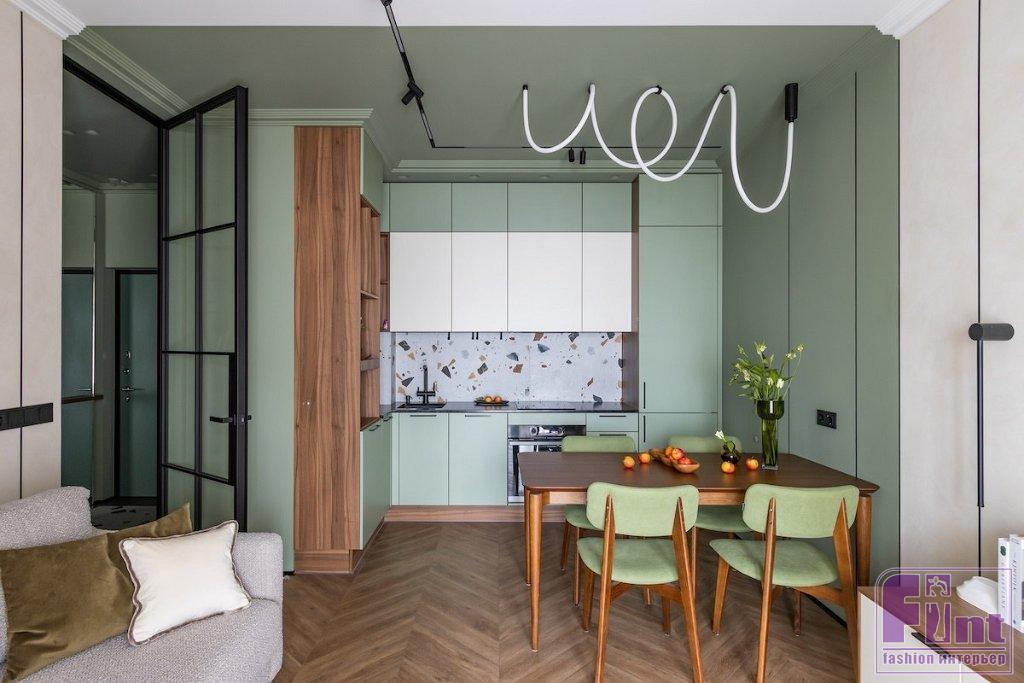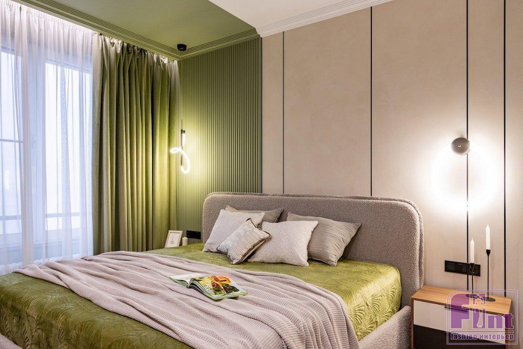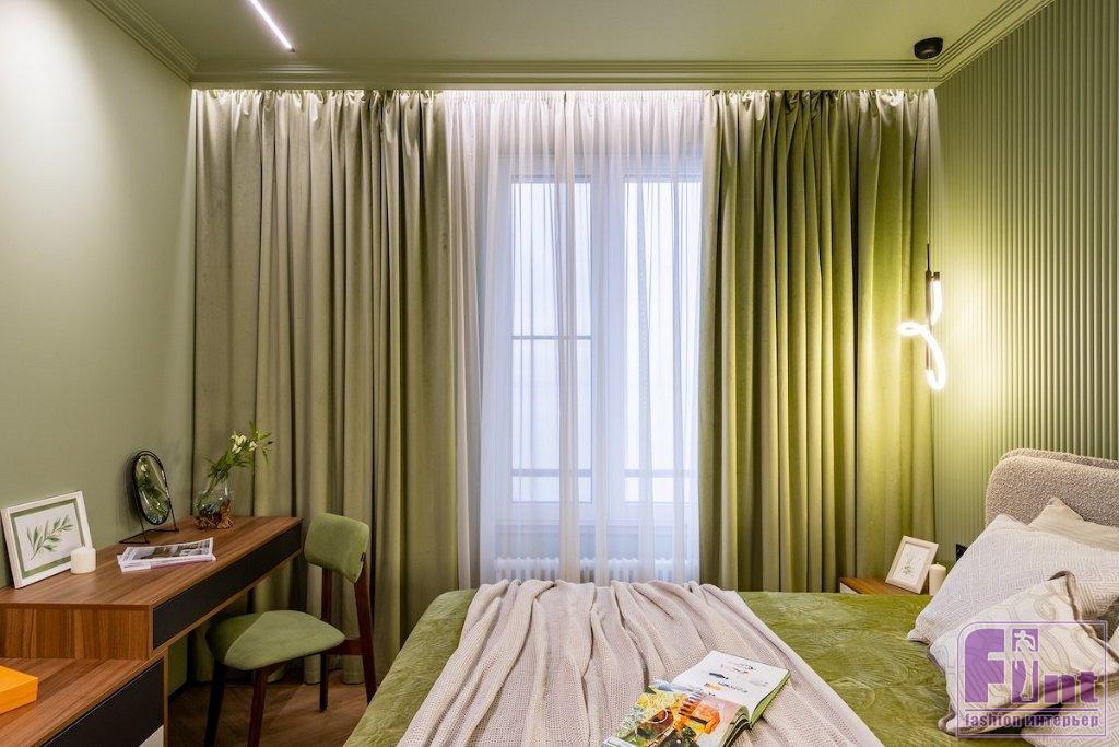 «За основу был выбран любимый цвет заказчицы — фисташковый. В этот цвет частично выкрашены стены и потолок. Как основной цвет я решила взять нейтральный бежевый, чтобы не перегружать интерьер. В компаньоны к фисташковому цвету я добавила дерево в тонировке орех, оно яркое, теплое и хорошо подошло к фисташковому. Также в интерьере добавлены небольшие акценты черного цвета», — рассказывает Дарина.