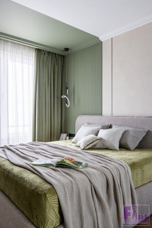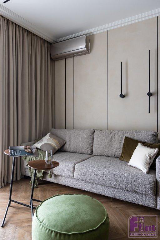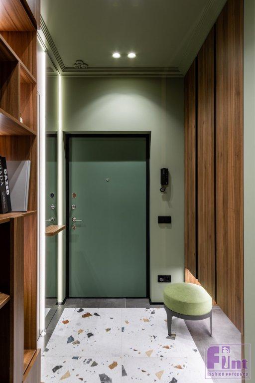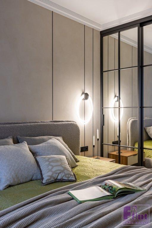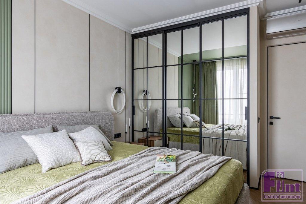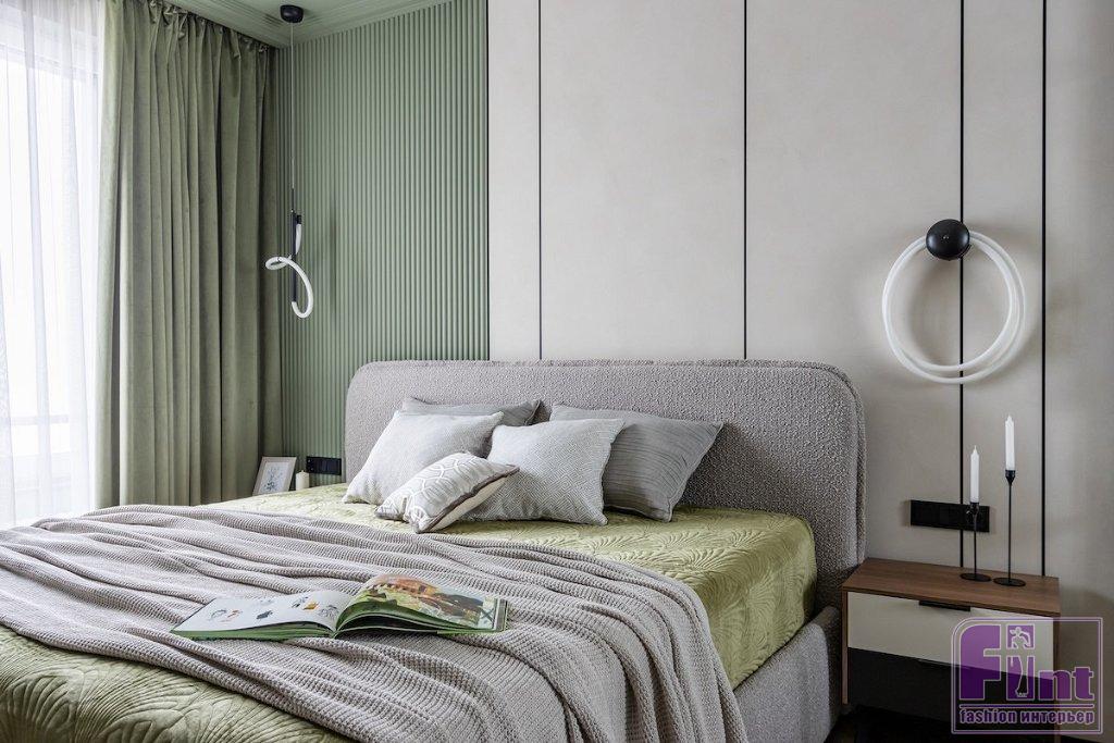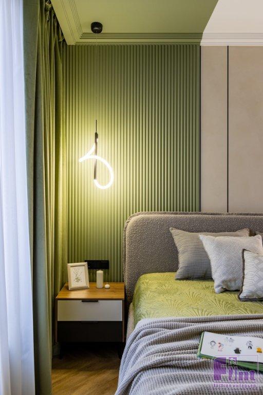 В отделке стен использовали декоративную фактурную штукатурку светлого оттенка и фисташковую краску. Причем краску «завели» и на потолок в прихожей, на кухне и у окна в спальне. Также для разнообразия в спальне применили объёмные настенные панели. Стены украсили тёмными металлическими профилями, которые помогают визуально вытянуть высоту потолка.