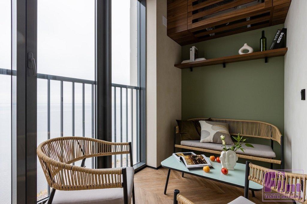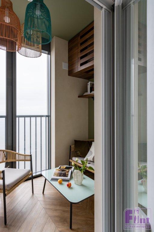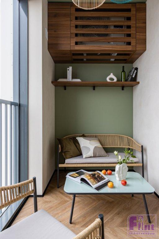 В гостиной — раскладной диван и ТВ-тумба. На лоджии обустроили зону отдыха из диванчика и кресла. Внешний блок кондиционера замаскировали с помощью тех же панелей, которые использовали в ванной комнате, сделали ящик с вентиляционными отверстиями. Кухню угловая. Верхние шкафы — до потолка. Антресольная часть и фасады нижних шкафов выполнены под цвет стен и потолка.